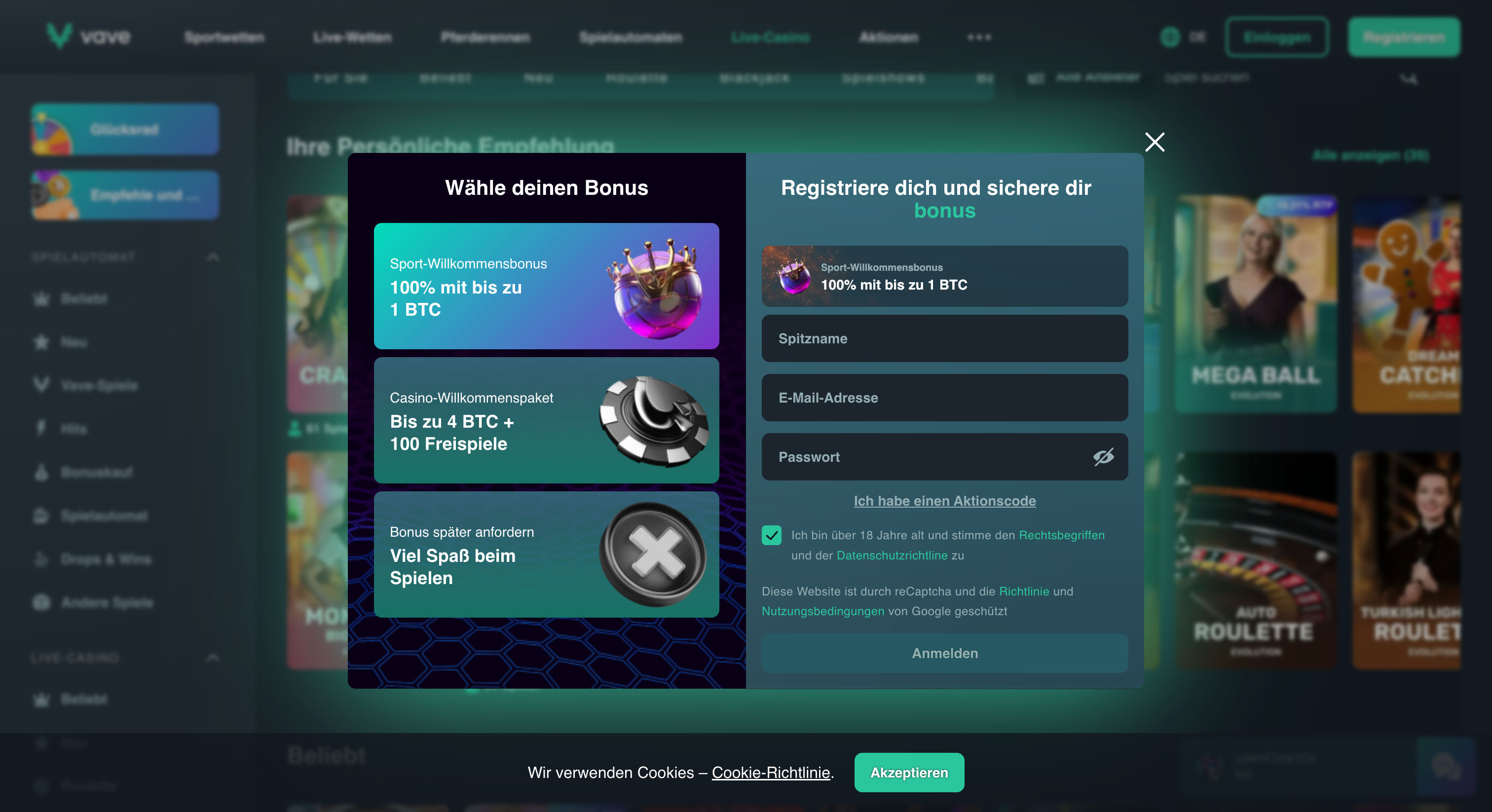 Der Anmeldeprozess ist im Vergleich zu anderen Plattformen, bei denen langwierige Verifizierungsprozesse abschreckend sein können, relativ schnell. Durch die Konzentration auf Einfachheit und Effizienz stellt Vave sicher, dass die Spieler ohne unnötige Verzögerungen in ihr Spielerlebnis eintauchen können.