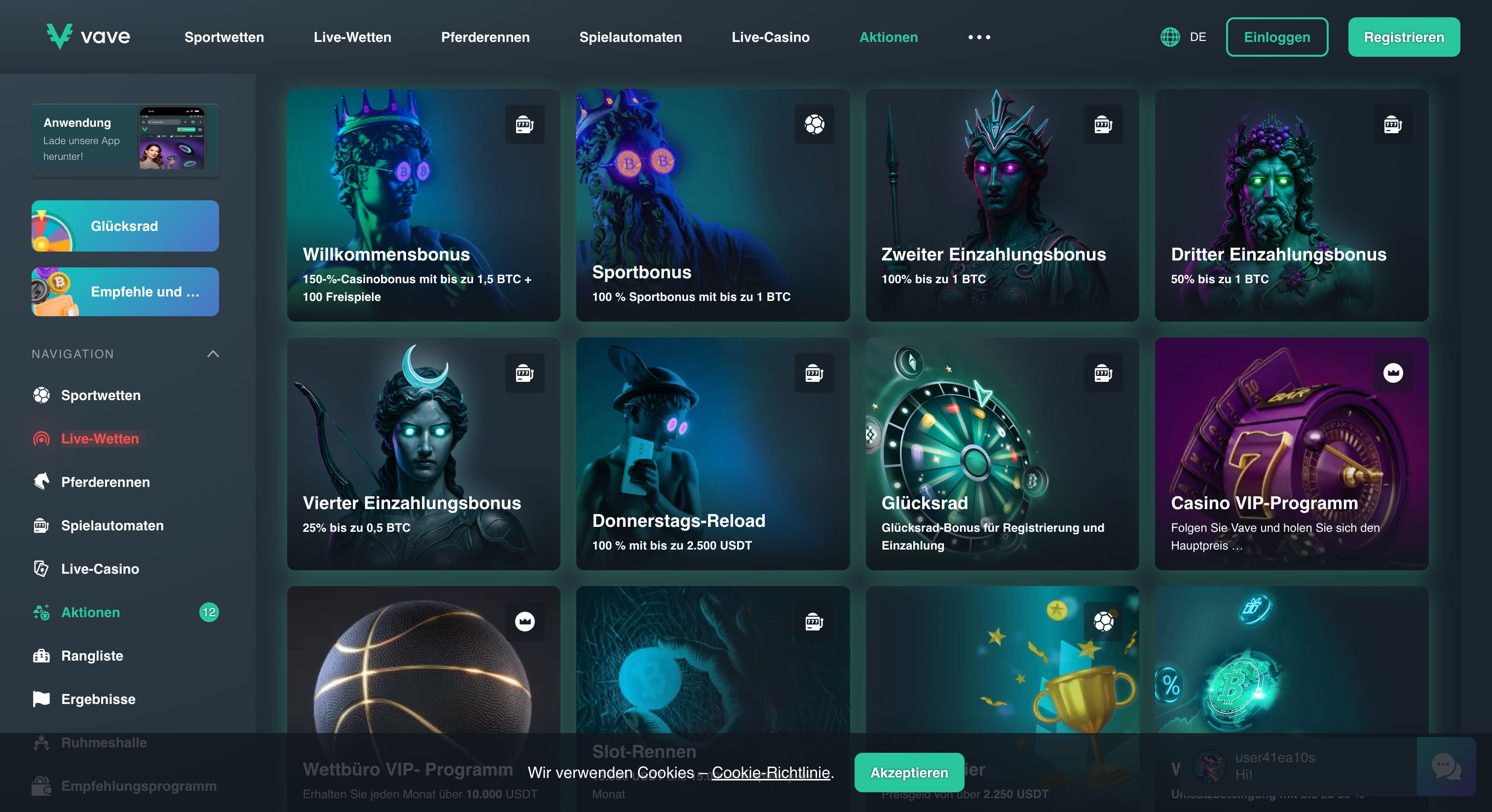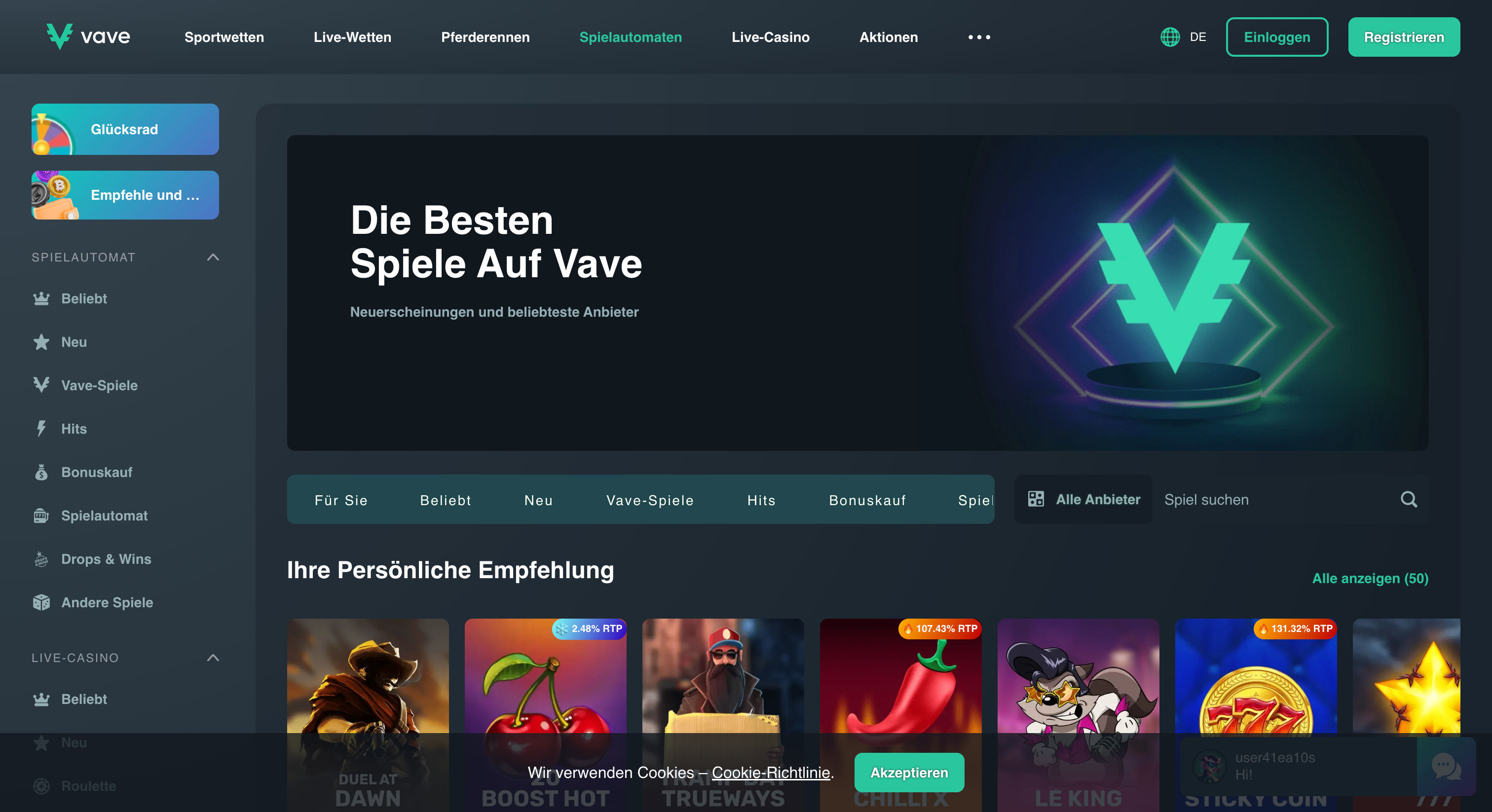 Dieses im Jahr 2022 gestartete Multiwährungs-Casino zielt darauf ab, ein fesselndes Spielerlebnis mit einer breiten Palette von Spielen, großzügigen Boni und benutzerfreundlichen Funktionen zu bieten. Mit über 10.000 Spielen von Top-Anbietern wie Evolution Gaming und Pragmatic Play positioniert sich Vave als starker Konkurrent in der wettbewerbsfähigen Online-Glücksspiellandschaft.