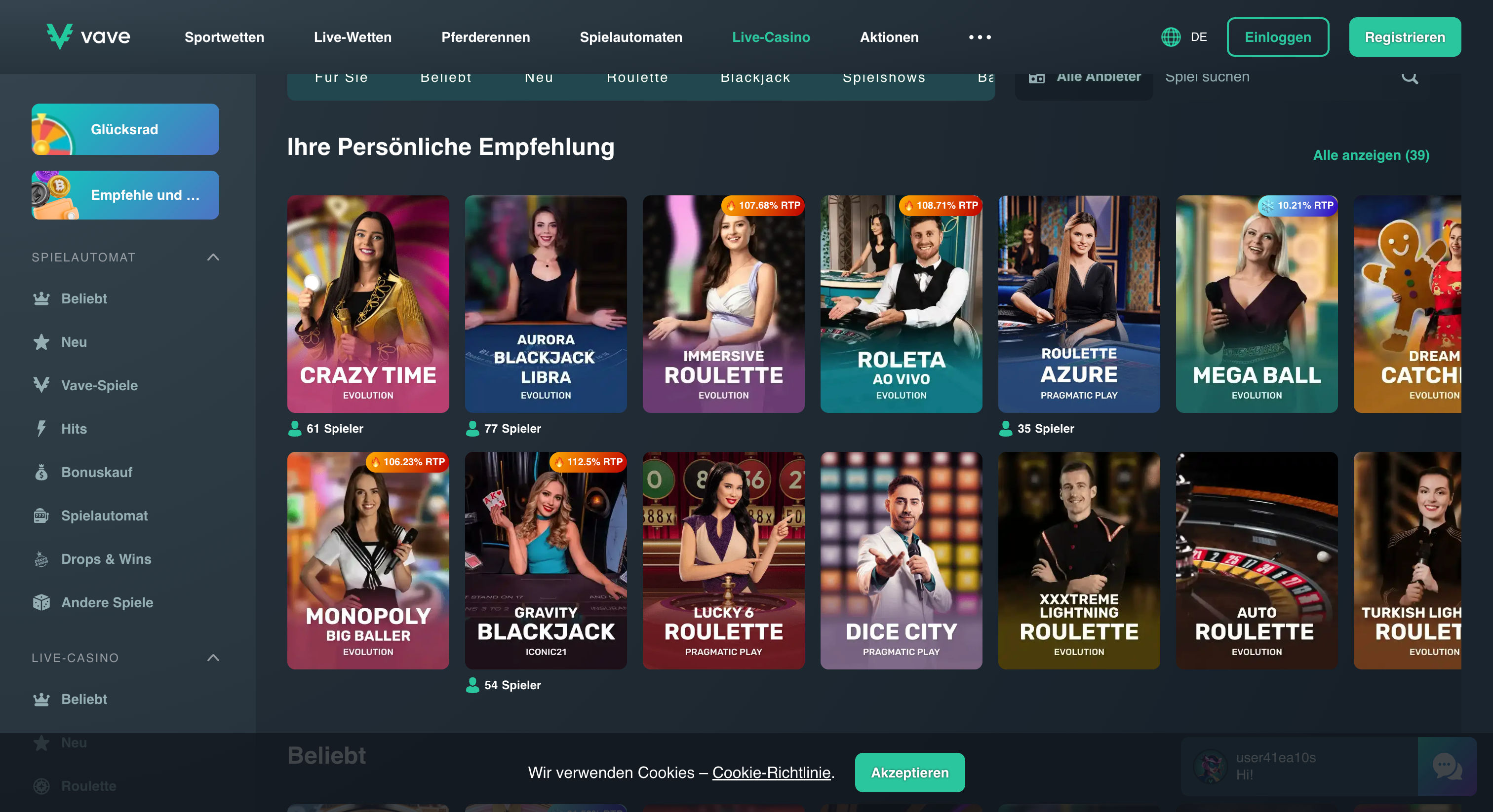 Umfangreiche Spielebibliothek Vave verfügt über eine beeindruckende Auswahl von über 10.000 Spielen, die die unterschiedlichsten Geschmäcker bedienen. Die Spielebibliothek umfasst beliebte Titel von renommierten Anbietern wie Evolution Gaming, Pragmatic Play und NetEnt. Diese umfangreiche Auswahl stellt sicher, dass die Spieler alles von klassischen Slots bis hin zu modernen Videospielen und Live Dealer Optionen finden können.
