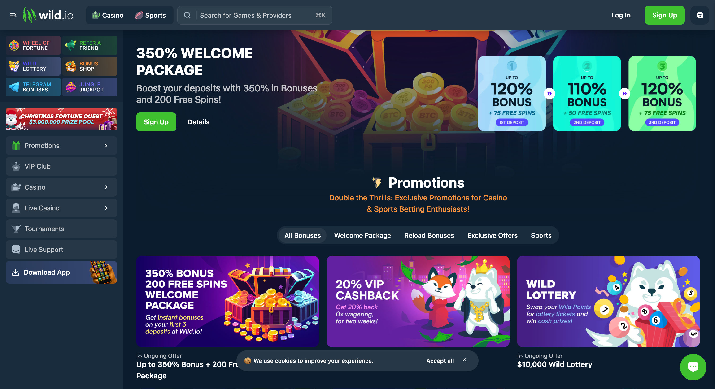 1. Beeindruckender Willkommensbonus: Neue Spieler bei Wild.io können von einem großzügigen Willkommensangebot profitieren, das einen 350%igen Einzahlungsbonus sowie 200 Freispiele beinhaltet. Dieser Anreiz ist im Vergleich zu anderen Krypto-Casinos ziemlich wettbewerbsfähig, was es zu einer attraktiven Option für diejenigen macht, die ihre Anfangsinvestition maximieren möchten.