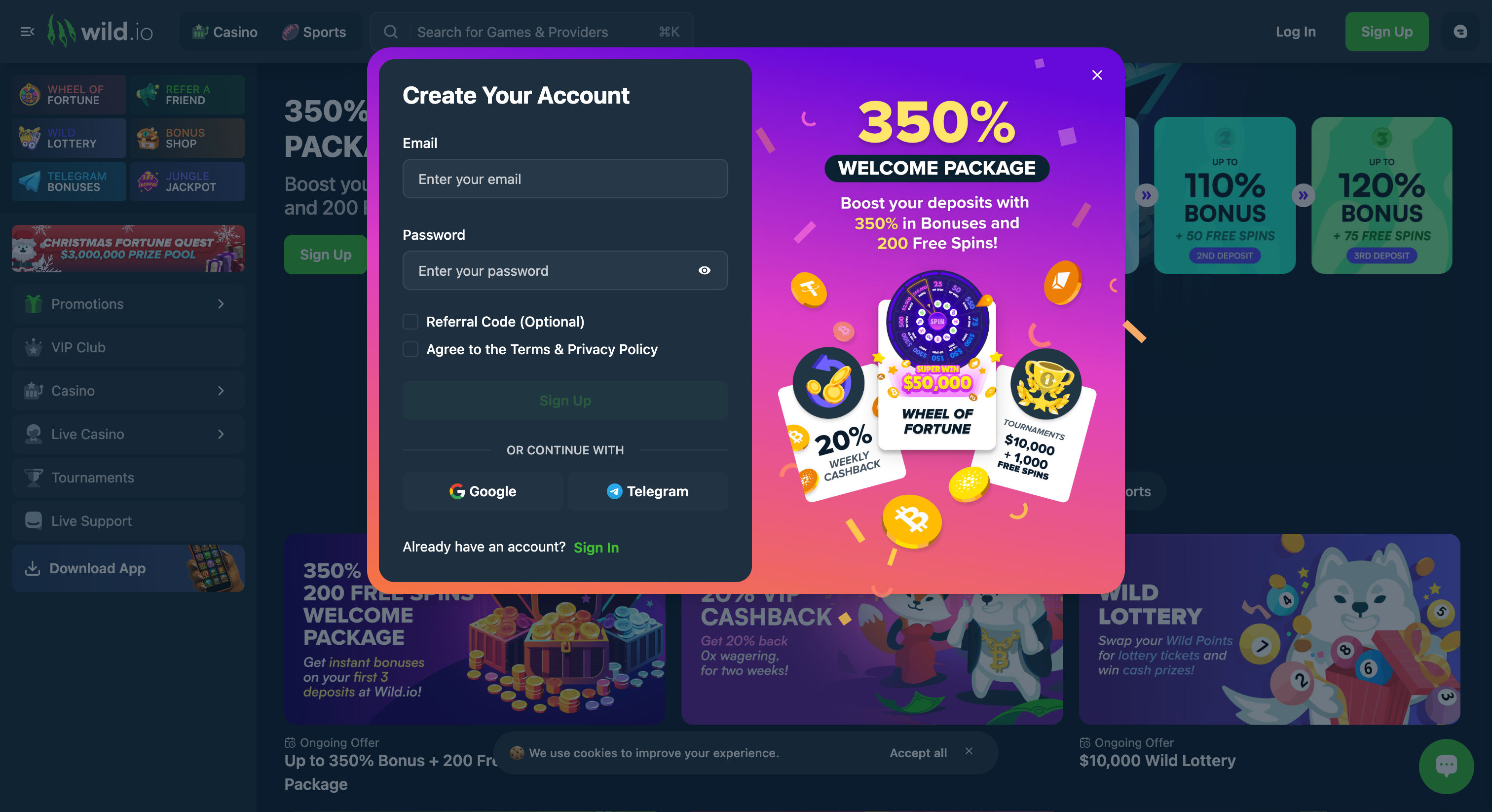 Die Anmeldung bei Wild.io ist eine unkomplizierte Angelegenheit, was im Bereich der Krypto-Casinos sehr erfrischend ist, wo komplizierte Registrierungsprozesse potenzielle Spieler oft abschrecken. Hier ist eine Aufschlüsselung dessen, was Sie erwarten können: