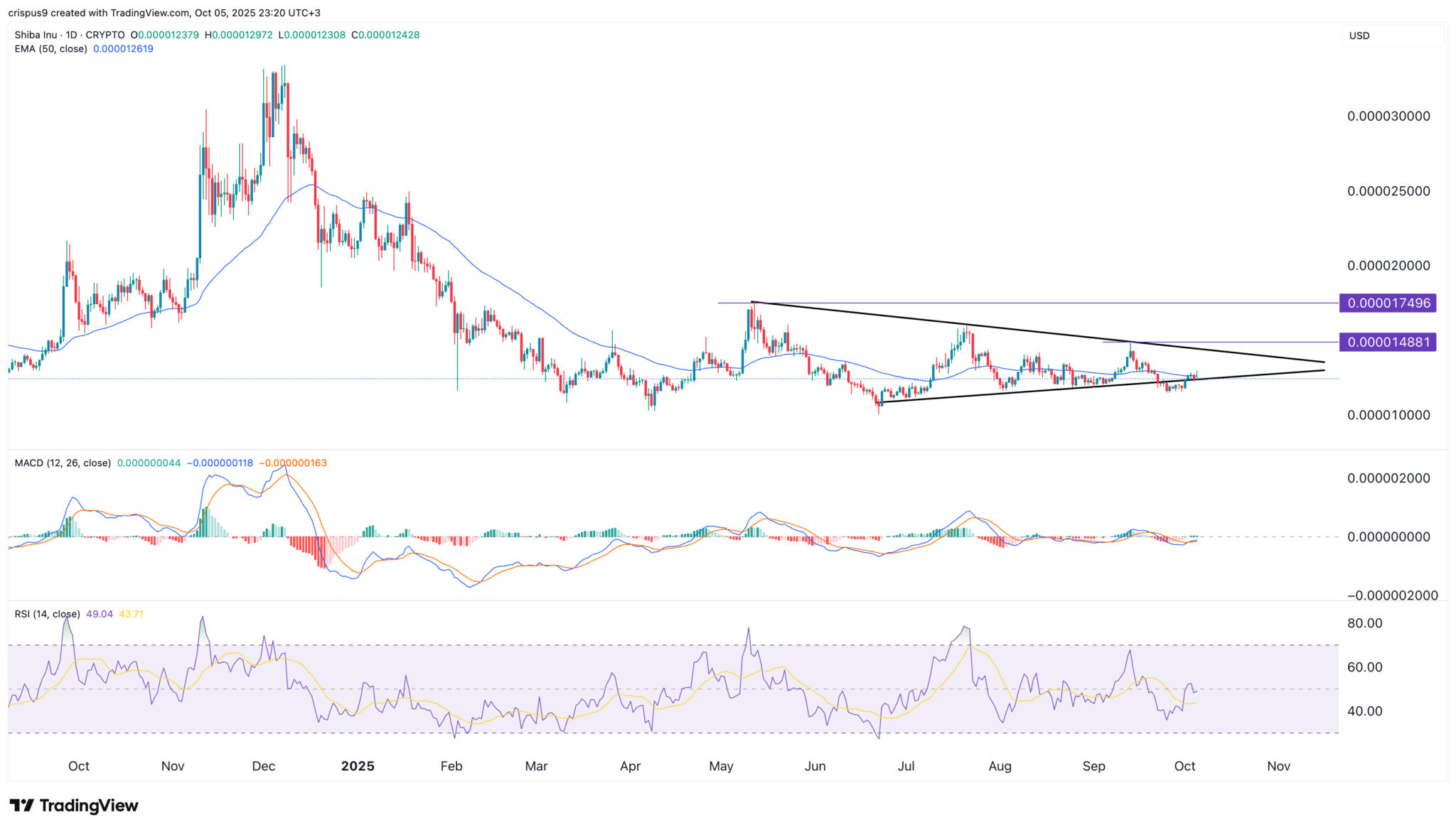 Der SHIB-Token konsolidiert sich am 50-tägigen Exponential Moving Average. Gleichzeitig bewegt er sich in der Nähe des Scheitelpunkts der beiden Linien des symmetrischen Dreiecksmusters.
