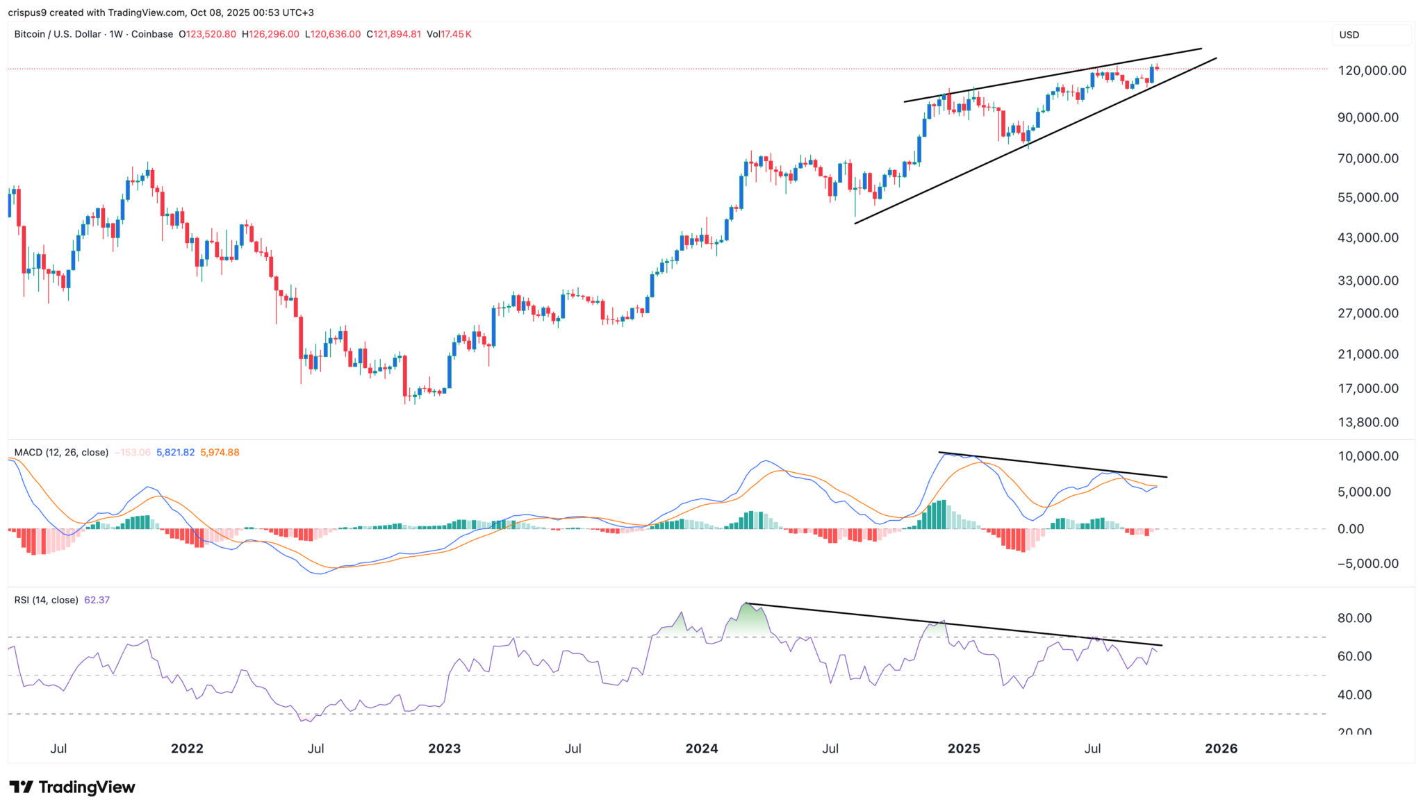 Das andere Hauptrisiko für den BTC- Kurs besteht darin, dass er ein riskantes Chartmuster auf Wochenbasis gebildet hat. Wie der Wochenchart zeigt, hat er ein riesiges steigendes Keilmuster gebildet. Dieses Muster setzt sich aus zwei aufsteigenden und konvergierenden Trendlinien zusammen.