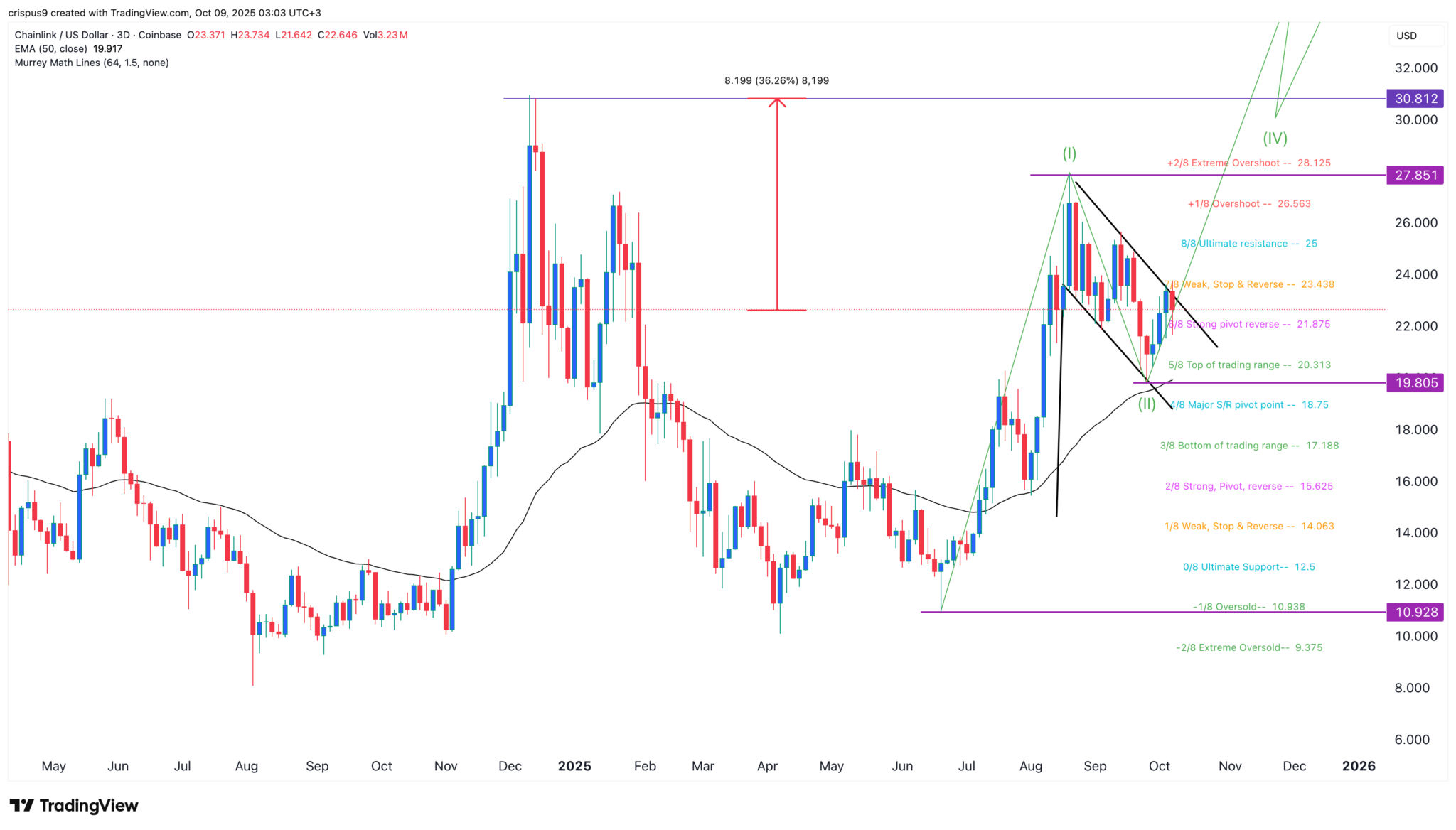 Der LINK-Kurs hat sich über den starken Pivot-Umkehrpunkt des Murrey Math Lines Tools bei 21,8 $ bewegt.