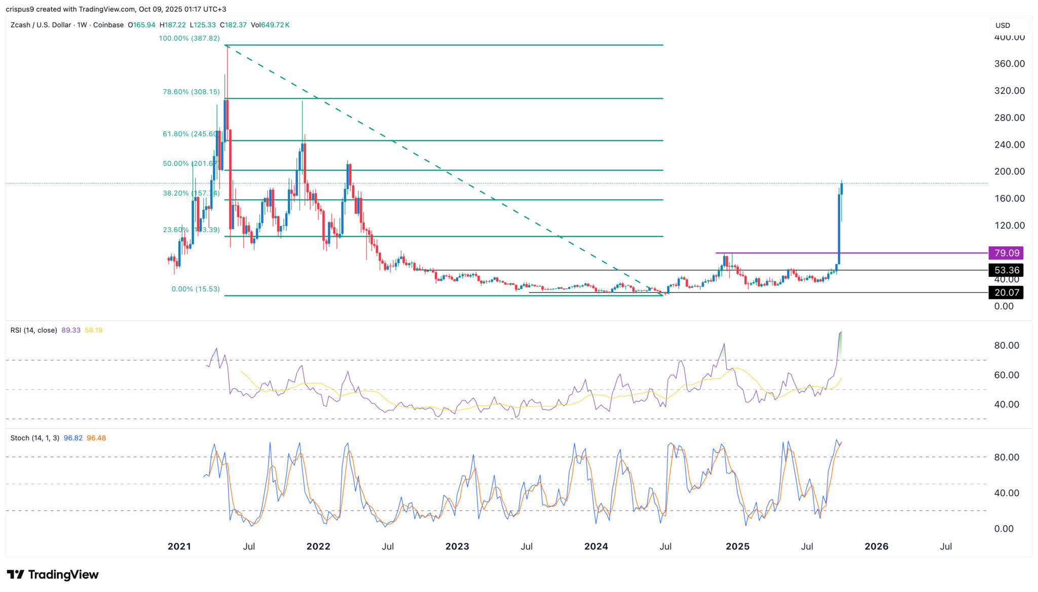 Der Zcash-Kurs setzte diese Woche seinen Short-Squeeze fort und erreichte den höchsten Stand seit 2022. ZEC erreichte einen Höchststand von $186,9 und lag damit deutlich über dem Tiefststand von $34 im letzten Monat. Dieser Anstieg machte Zcash zu einem der Token mit der besten Performance in diesem Monat.
