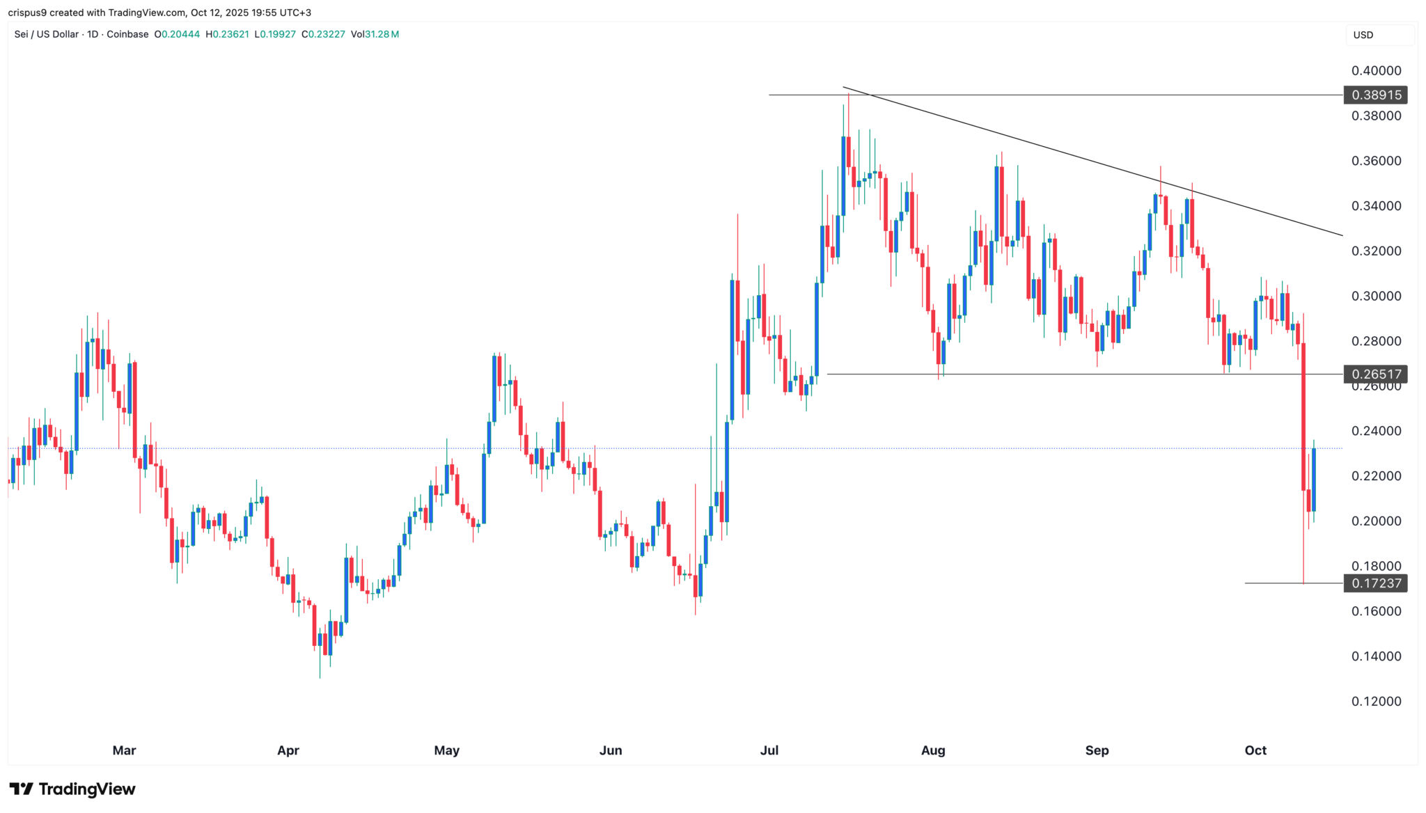 Das Tagesdiagramm zeigt, dass der Sei-Kurs auf einen Tiefststand von 0,1723 $ gefallen ist und damit unter dem bisherigen Jahreshoch von 0,3891 $ liegt. Er bewegte sich unter die wichtige Unterstützung bei 0,2651 $, der Unterseite des absteigenden Dreiecksmusters.