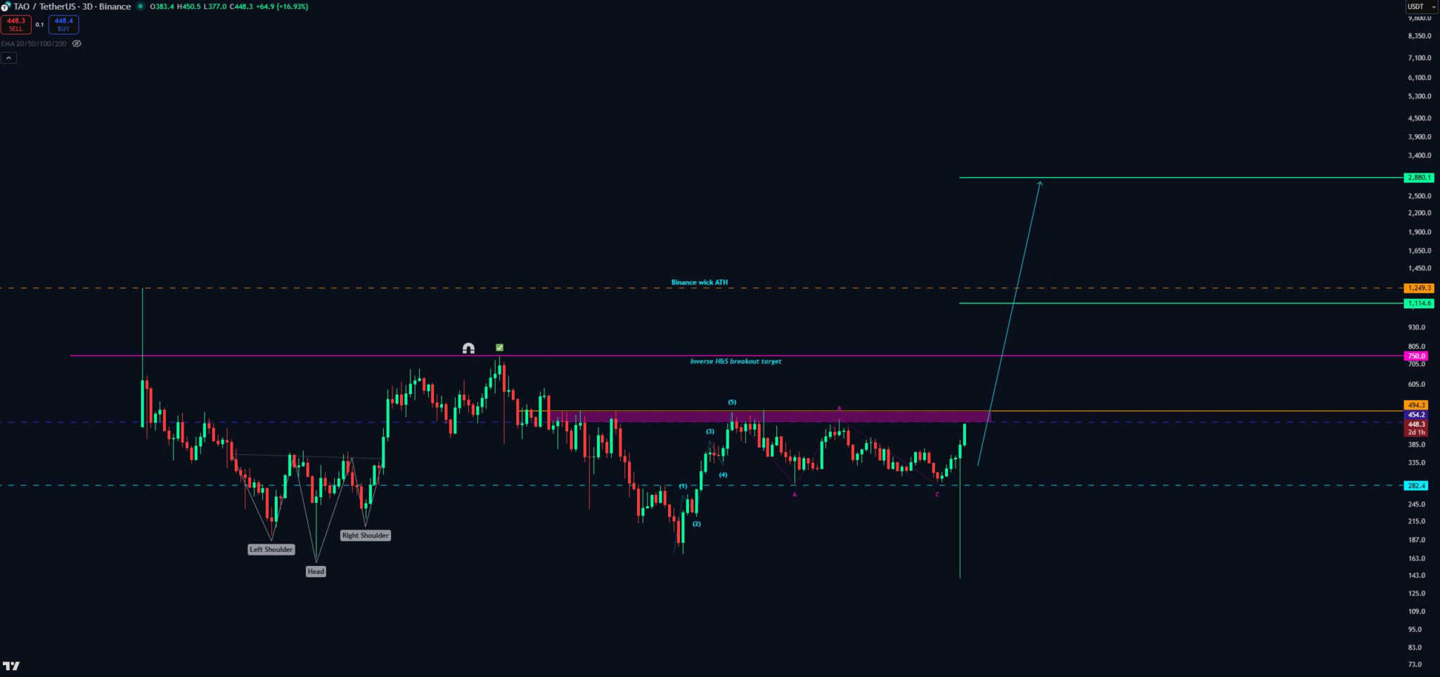 Der beliebte Krypto-Händler DonaXbτ betonte, dass sich Bittensor TAO “dem wichtigsten Widerstandsniveau nähert”, einer Zone, die bei früheren Erholungen mehrfach zu Rückschlägen führte. Ein sauberer Ausbruch über 500 $ könnte den offiziellen Übergang in einen Bullenmarkt markieren und das bestätigen, was Chartisten als Welle 3 der impulsiven Struktur bezeichnen.