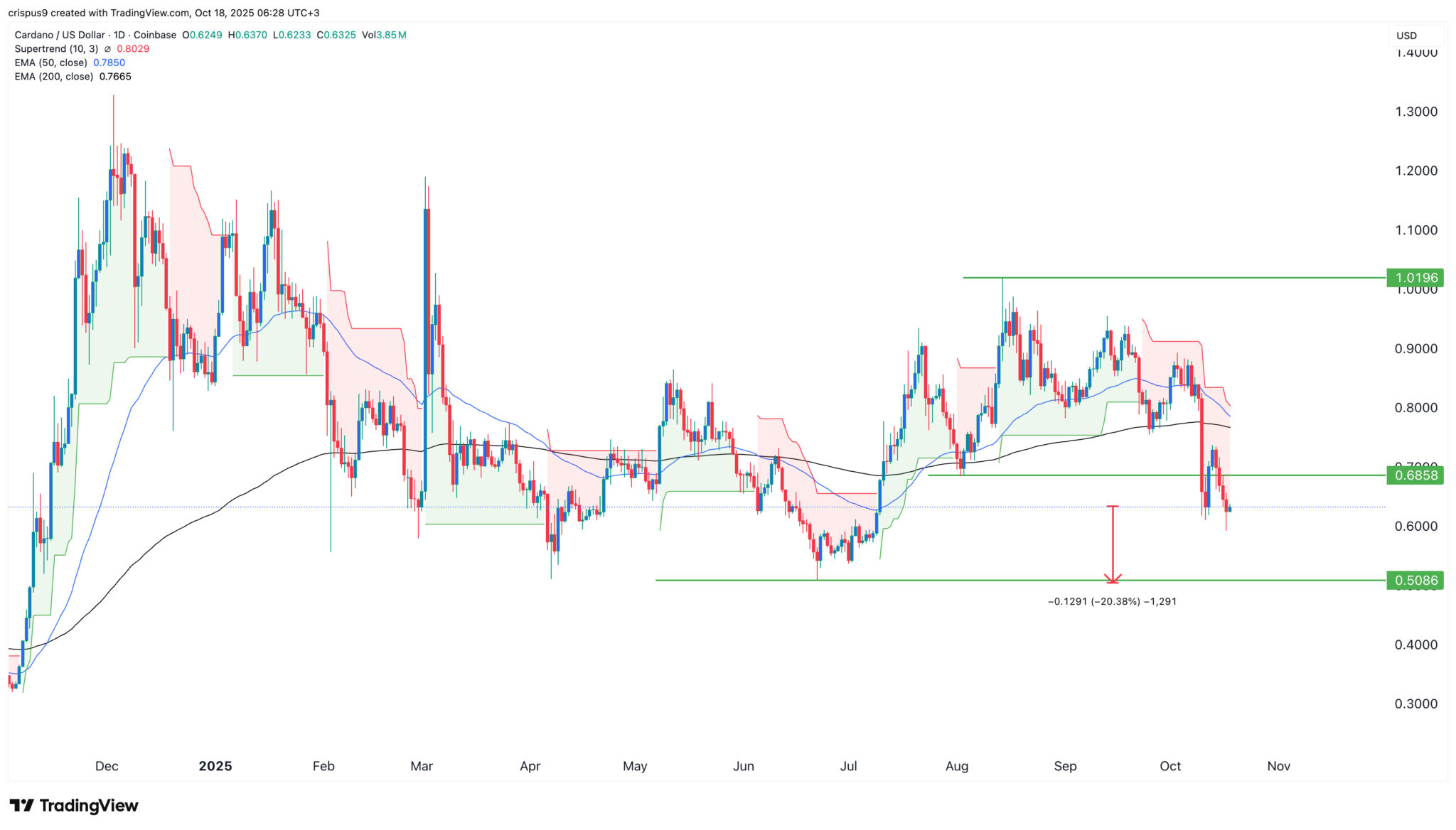 Das Tagesdiagramm zeigt, dass der Cardano-Kurs in den letzten Monaten von einem Höchststand von 1,020 $ im August auf einen Tiefststand von 0,5950 $ gefallen ist.