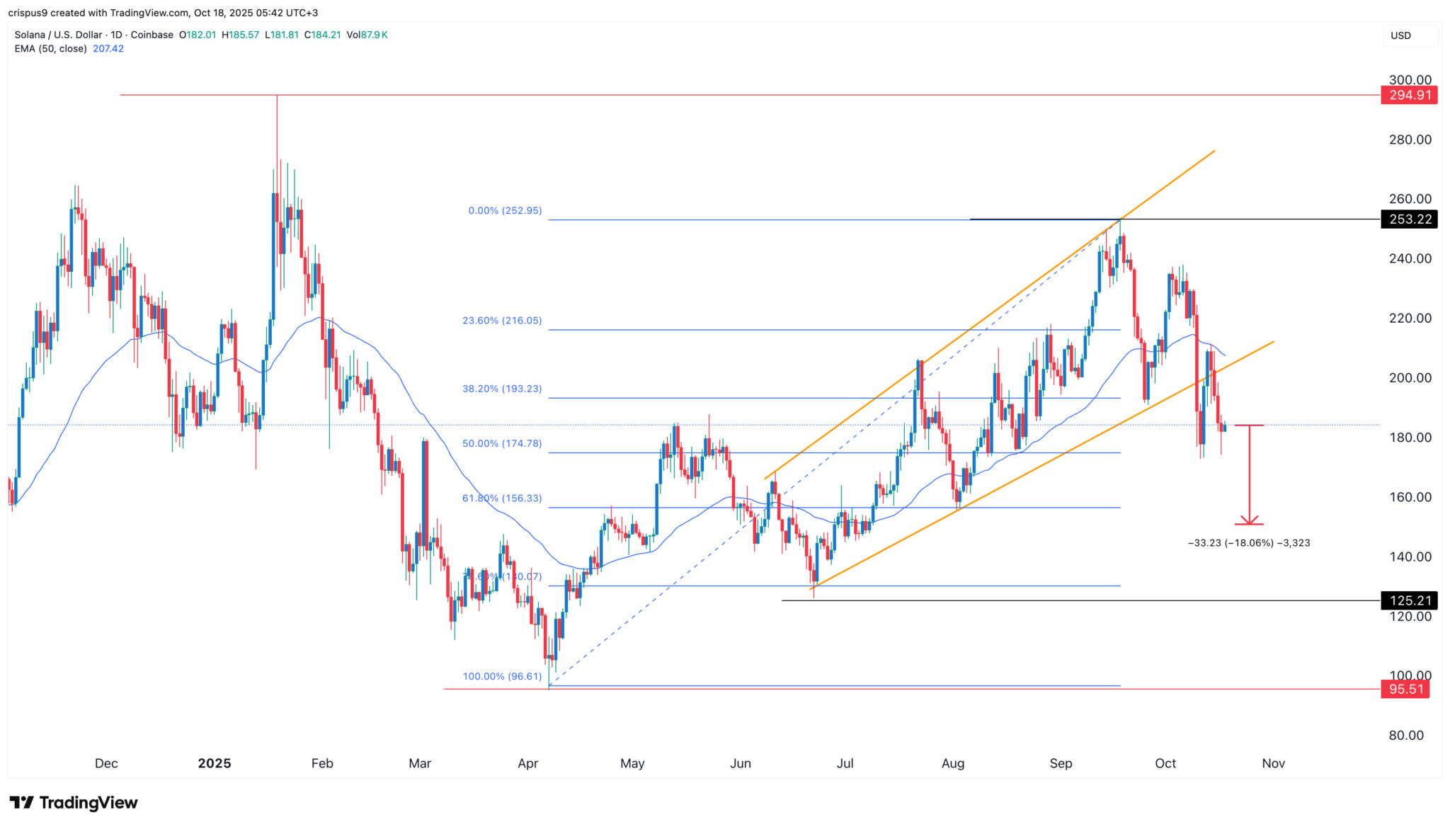 Der SOL-Kurs ist unter den exponentiellen gleitenden 50-Tage-Durchschnitt gefallen, was ein Zeichen dafür ist, dass der Abwärtstrend anhält. Er ist auch unter die untere Seite des ansteigenden, sich verbreiternden Keilmusters gefallen, das allgemein als Megaphon bekannt ist. Dieses Muster ist eines der bullischsten in der technischen Analyse.