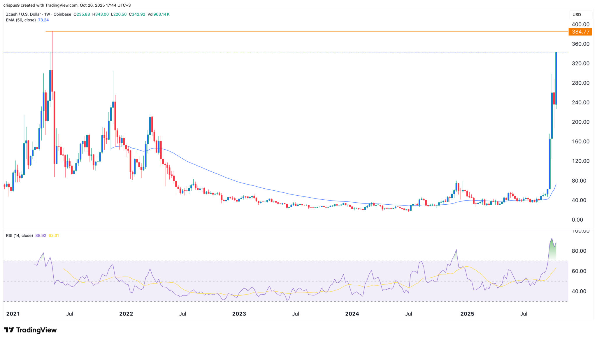Zcash Preis-Chart | Quelle: TradingViewDer Wochenchart zeigt, dass sich der ZEC-Kurs in den letzten Monaten erholt hat. Dieser Anstieg erfolgte, als der Token von der Akkumulations- in die Aufwertungsphase der Wyckoff-Theorie wechselte. Er befindet sich jetzt in der Aufwertungsphase, die durch eine hohe Nachfrage seitens der Investoren gekennzeichnet ist.