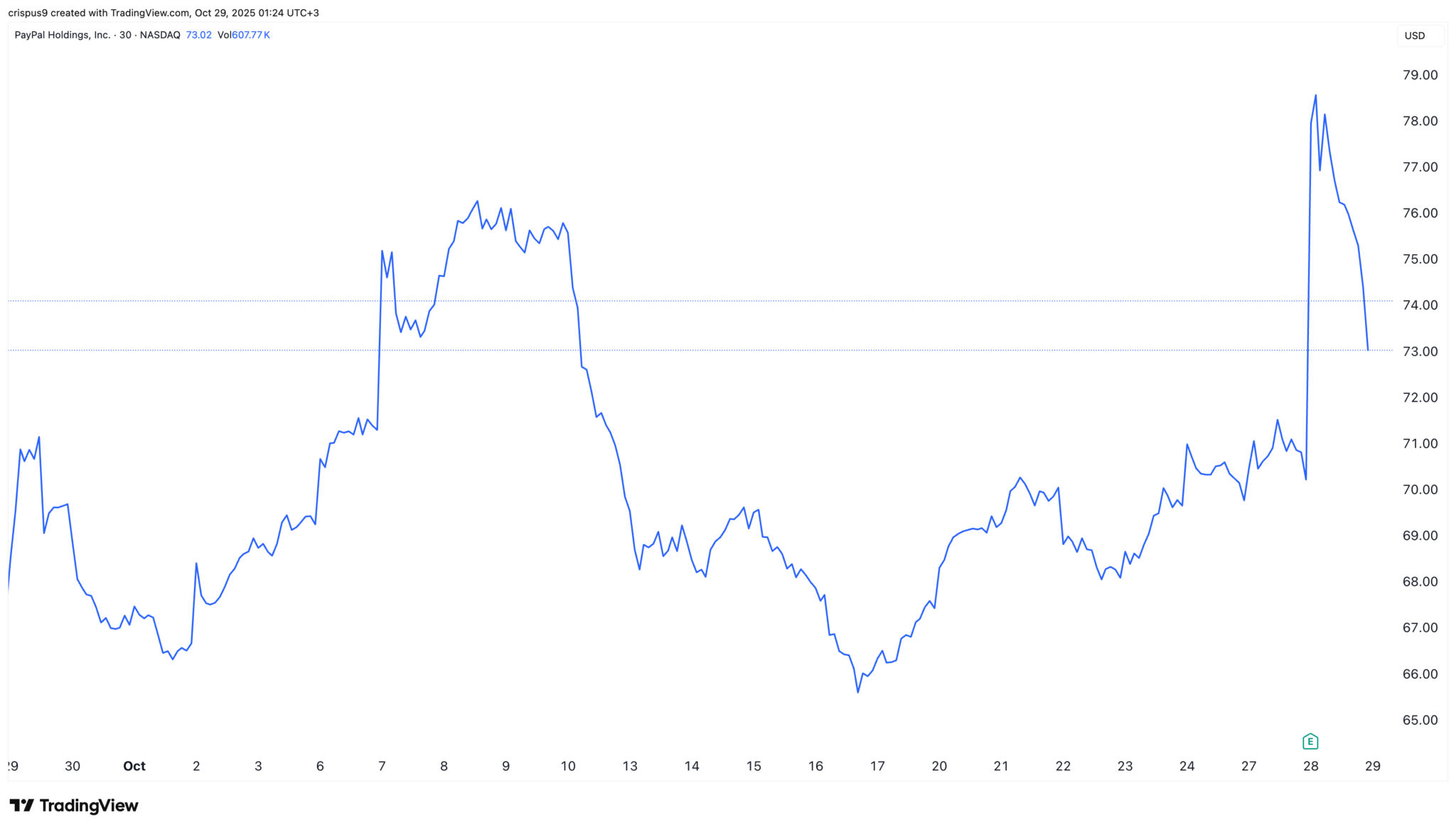 Der Aktienkurs von PayPal stieg auf den höchsten Stand seit Juli, nachdem der Fintech-Riese starke Finanzergebnisse veröffentlicht und einen Plan angekündigt hatte, die Aktionäre mit Dividenden zu belohnen. PYPL erreichte einen Höchststand von 79,16 $, ein Plus von 20 % gegenüber dem Tiefststand in diesem Monat, und fiel dann auf 73 $ zurück.