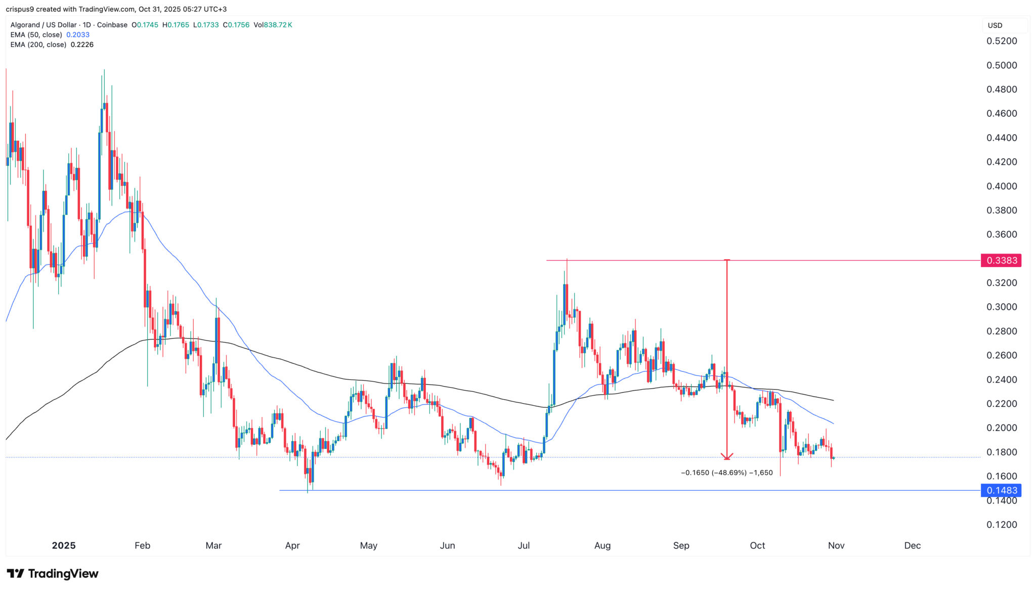Der ALGO-Kurs hat ein Todeskreuzmuster gebildet, bei dem sich der 50-Tage- und der 200-Tage-Exponential Moving Averages (EMA) gekreuzt haben. Dies ist eines der beliebtesten bärischen Muster in der technischen Analyse.