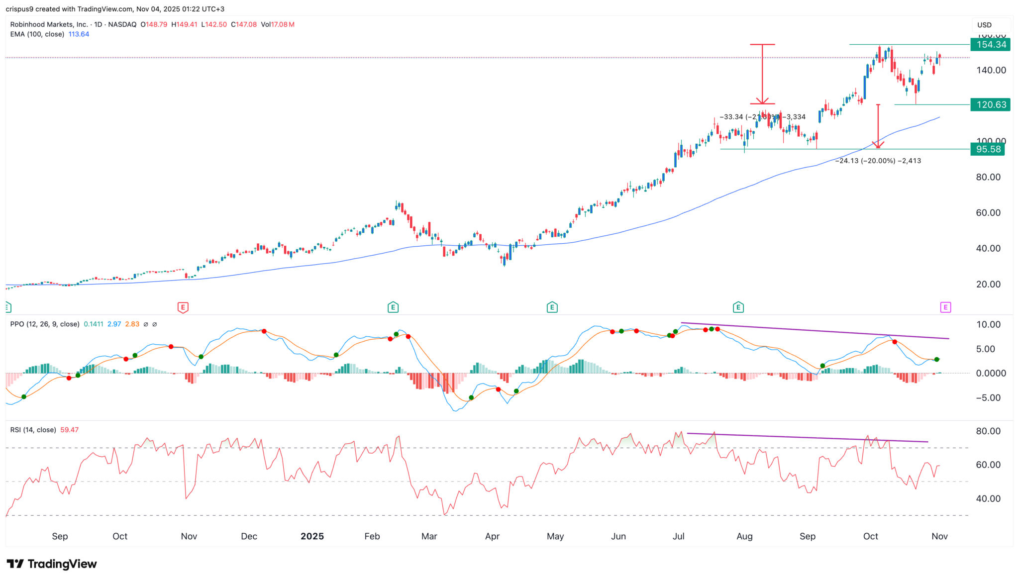 Das Tagesdiagramm zeigt, dass der HOOD-Aktienkurs im Oktober mit 154,35 $ seinen Höchststand erreichte und dann auf einen Tiefststand von 120 $ am 22. Oktober zurückfiel.