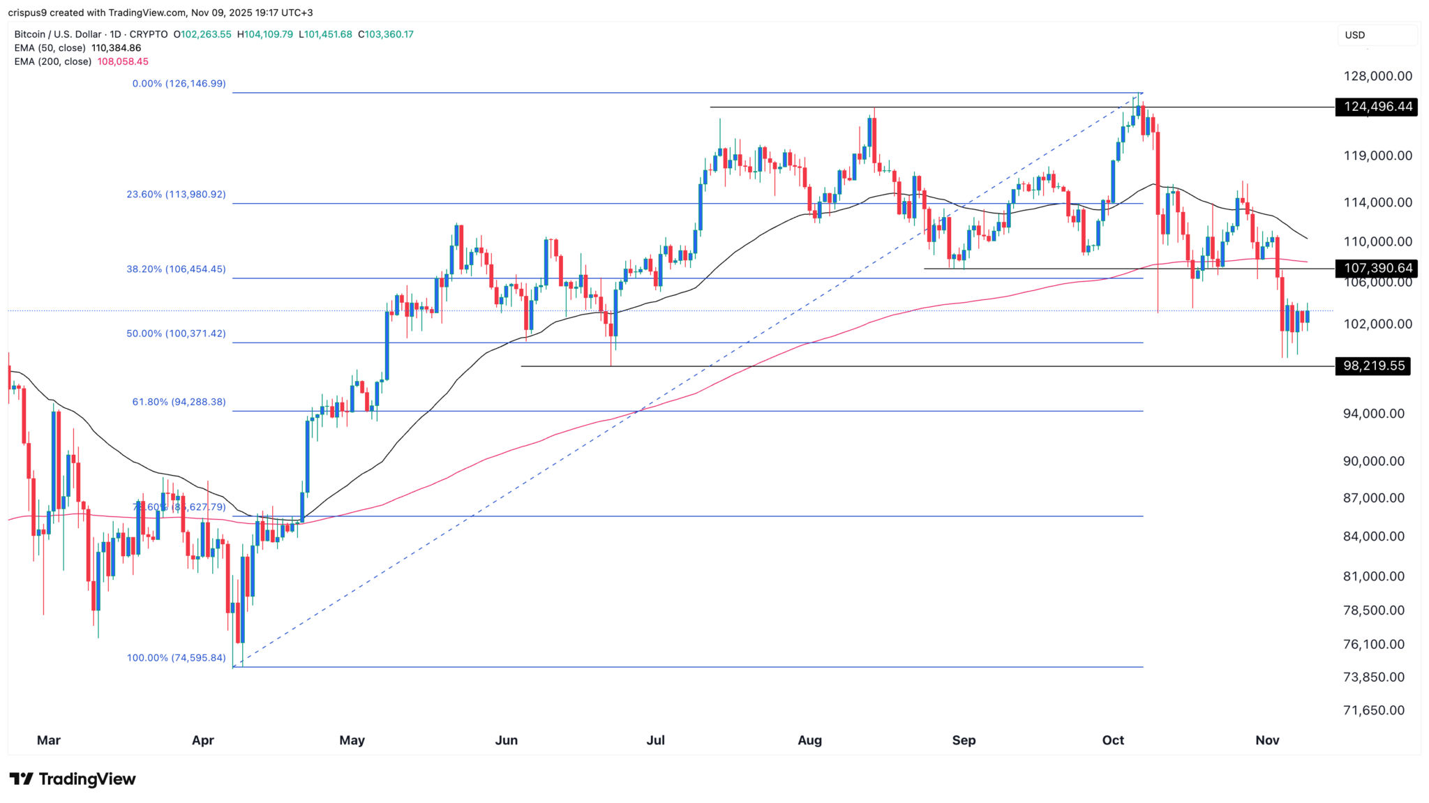 Das Tagesdiagramm zeigt, dass der BTC-Kurs weiterhin unter Druck steht, nachdem er im Oktober einen Höchststand von 126.300 $ erreicht hatte. Inzwischen ist er unter die wichtige Unterstützung bei 107.390 $, dem niedrigsten Stand seit August, gefallen. Dies ist eine wichtige Unterstützung, da es sich um die Nackenlinie des Doppel-Top-Musters bei 124.500 $ handelt.