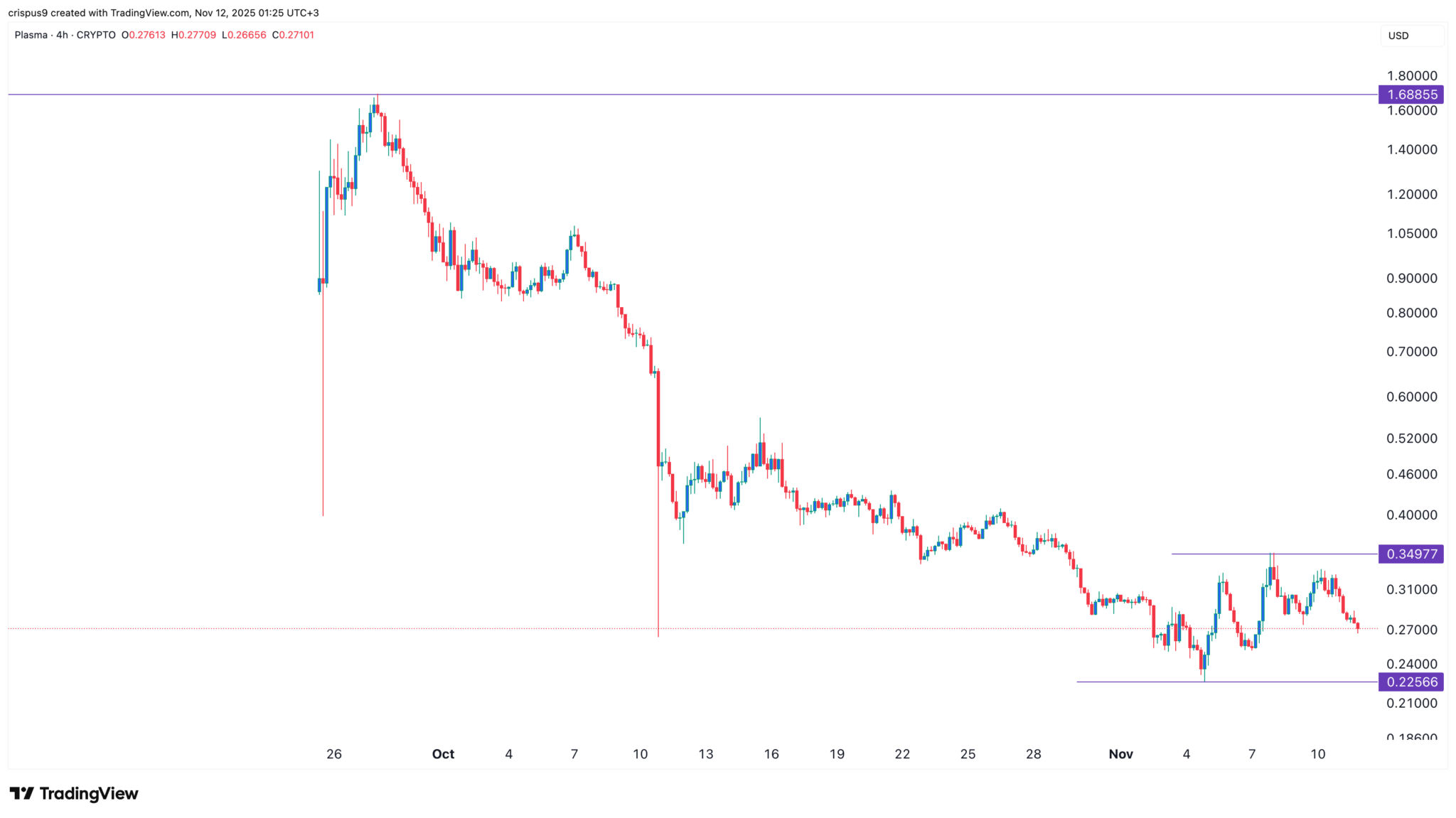 Der XPL-Kurs setzte in dieser Woche seinen freien Fall fort und bewegt sich nun in der Nähe seines Allzeittiefs, während der Kryptomarkt sich zurückzieht und seine wichtigsten Kennzahlen einbrechen. Der Plasma-Token wurde mit 0,2700 $ gehandelt und lag damit unter dem bisherigen Jahreshoch von 1,68 $, während seine Marktkapitalisierung von fast 3 Milliarden $ auf 483 Millionen $ fiel.