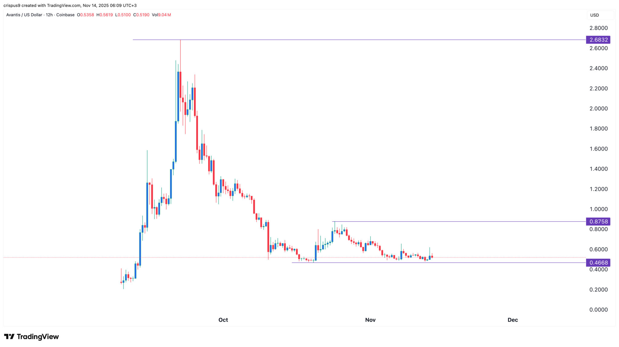 Der 12-Stunden-Chart zeigt, dass der AVNT-Kurs vom bisherigen Jahreshoch von 2,68 $ im September auf heute 0,5145 $ gefallen ist.