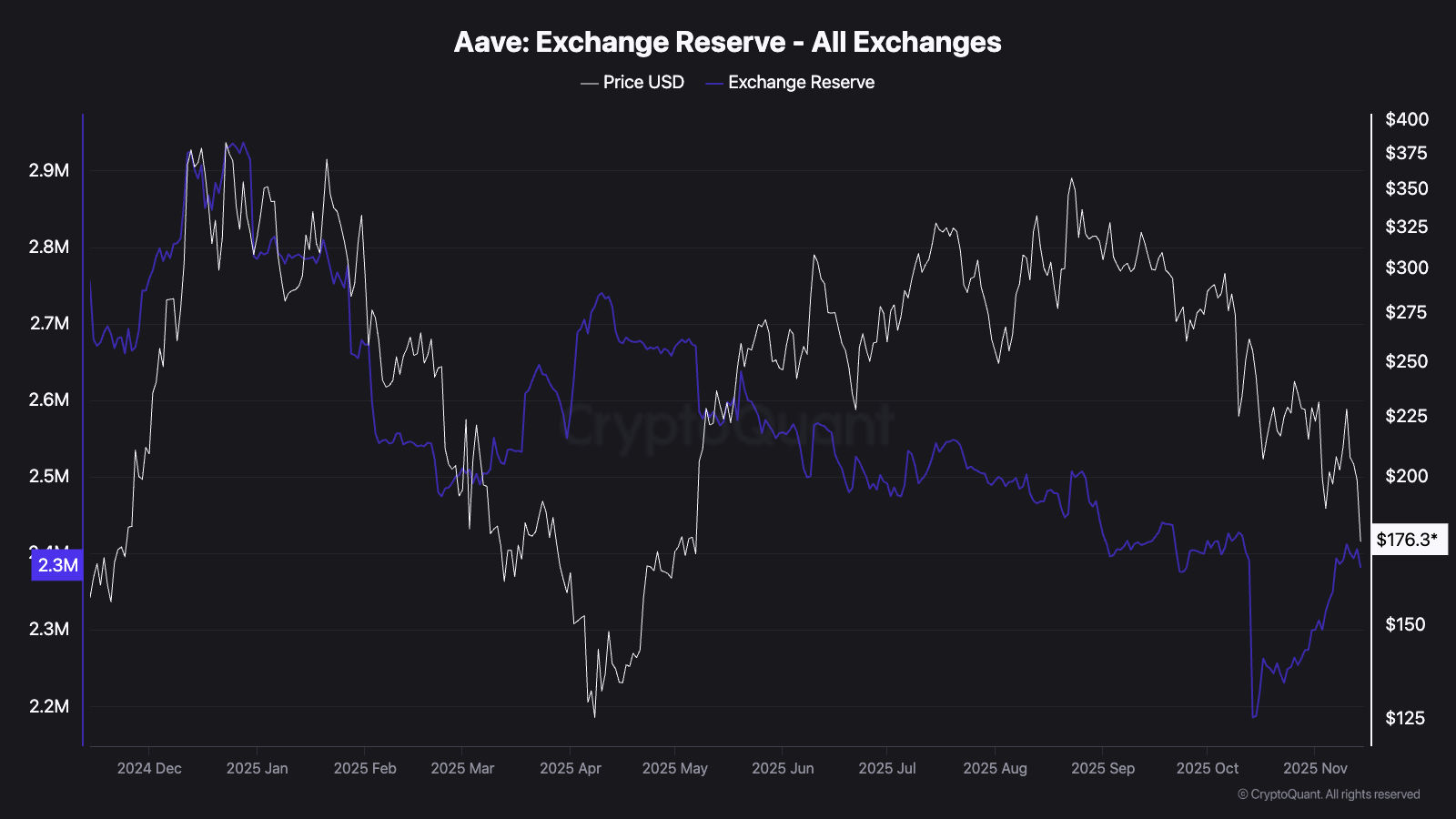 Die On-Chain-Kennzahlen zeigen ein geteiltes Bild. Die Börsenreserven für AAVE sinken per CryptoQuant weiter, was normalerweise ein Zeichen für eine Akkumulation ist, aber die Liquidität am Spotmarkt war während des Ausverkaufs insgesamt dünn, so dass weniger Gebote abgegeben wurden, um das ausgehende Angebot zu absorbieren.