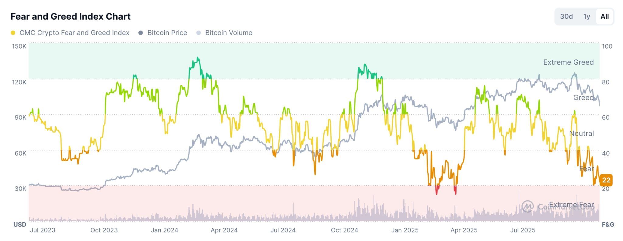 Inzwischen herrscht in der Kryptobranche extreme Angst. Die Daten zeigen, dass der Fear and Greed Index auf einen Wert von 22 gesunken ist und damit unter dem bisherigen Jahreshoch von 85 liegt.