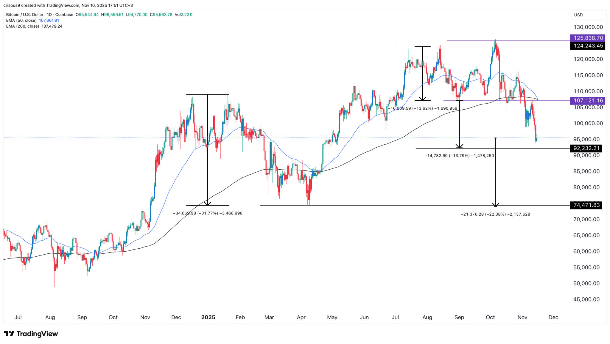 Der Bitcoin-Kurs befand sich in den letzten Wochen in einem starken freien Fall, da er in einen technischen Bärenmarkt überging. BTC ist von seinem bisherigen Jahreshoch von 126.320 $ auf heute 95.000 $ abgestürzt. Ist es also an der Zeit, den BTC-Kurssturz zu kaufen oder zu vermeiden?
