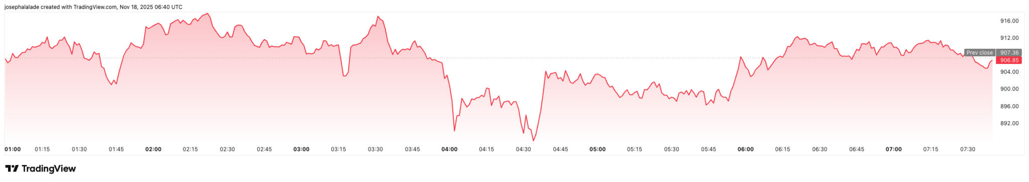 BNB Coin konnte sich heute nur mit Mühe im Bereich zwischen $900 und $925 halten, während der breite Markt seine aggressive Hebelwirkung weiter abbaute. Der BNB-Kurs bewegte sich um 908 $, was einem Rückgang von etwa 2,6 % entspricht, und die Charts spiegeln die gleiche unruhige, drucklastige Struktur wider, die bei den wichtigsten Altcoins zu beobachten ist.