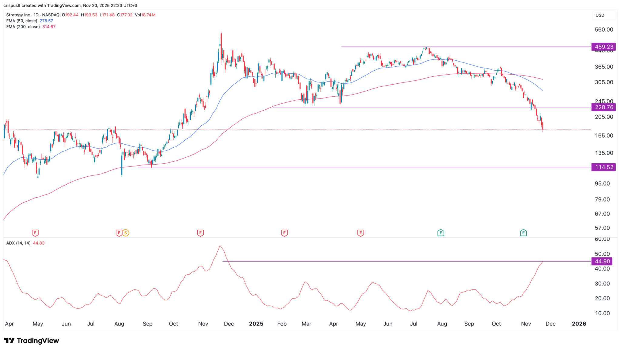 Chart des Strategie-Aktienkurses | Quelle: TradingViewDas Tagesdiagramm zeigt, dass sich der Kurs der Strategy-Aktie in den letzten Monaten in einem starken Abwärtstrend befand und von einem Höchststand von 460 $ im Juli auf aktuell 172 $ gefallen ist.