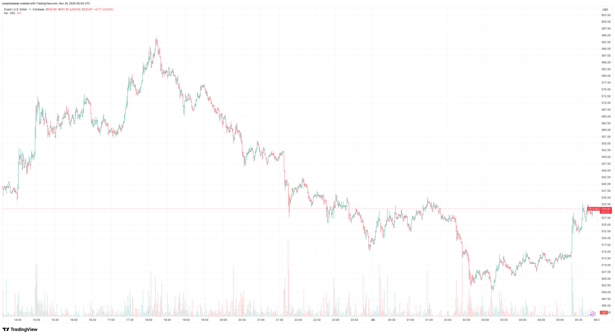 Der Zcash-Kurs-Chart von TradingView bestätigt die Zurückhaltung. ZEC notiert knapp über einem Docht von 520 USD am frühen Morgen, mit unmittelbarer Unterstützung bei 500 USD und einer steigenden diagonalen Unterstützungstrendlinie bei 452 USD.