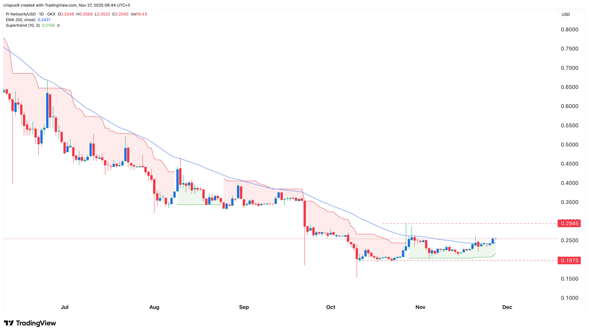 Pi hat sich über den Supertrend-Indikator bewegt, der in der technischen Analyse ein sehr bullisches Zeichen ist. Er ist auch über den 50-Tage-EMA (Exponential Moving Average) gestiegen.