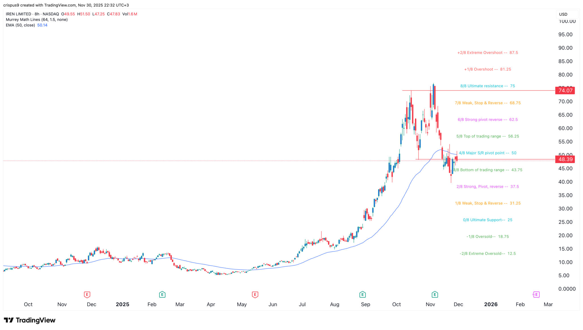 Das Tagesdiagramm zeigt, dass der Kurs der IREN-Aktie in den letzten Tagen gefallen ist. Dieser Rückgang hat den Kurs unter den Major S/R Pivot Point des Murrey Math Lines Tools gedrückt.