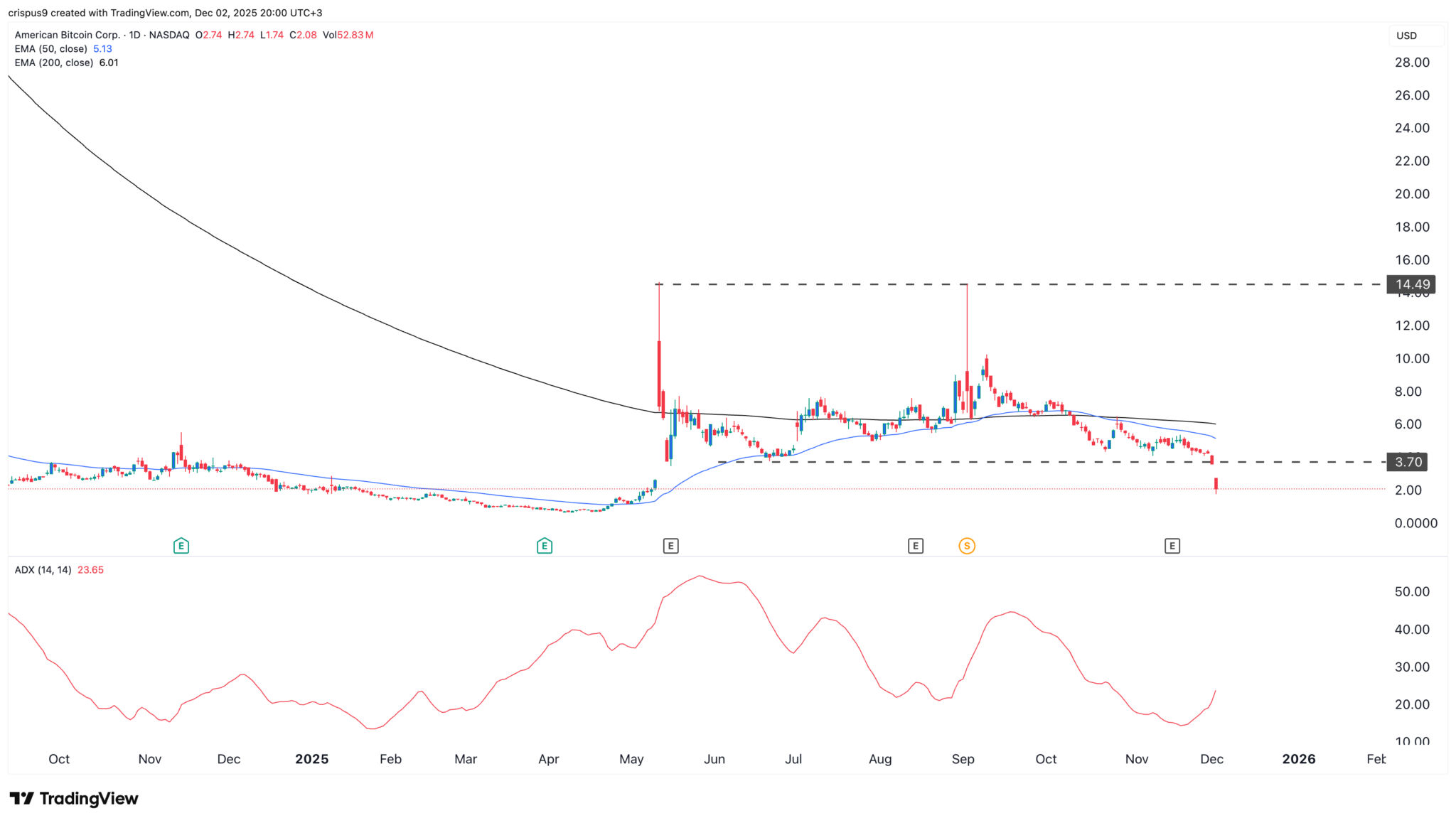 Der Kurs der American Bitcoin-Aktie ist in den letzten Monaten stark gesunken, da die Nachfrage nach Treasury-Unternehmen nachgelassen hat.
