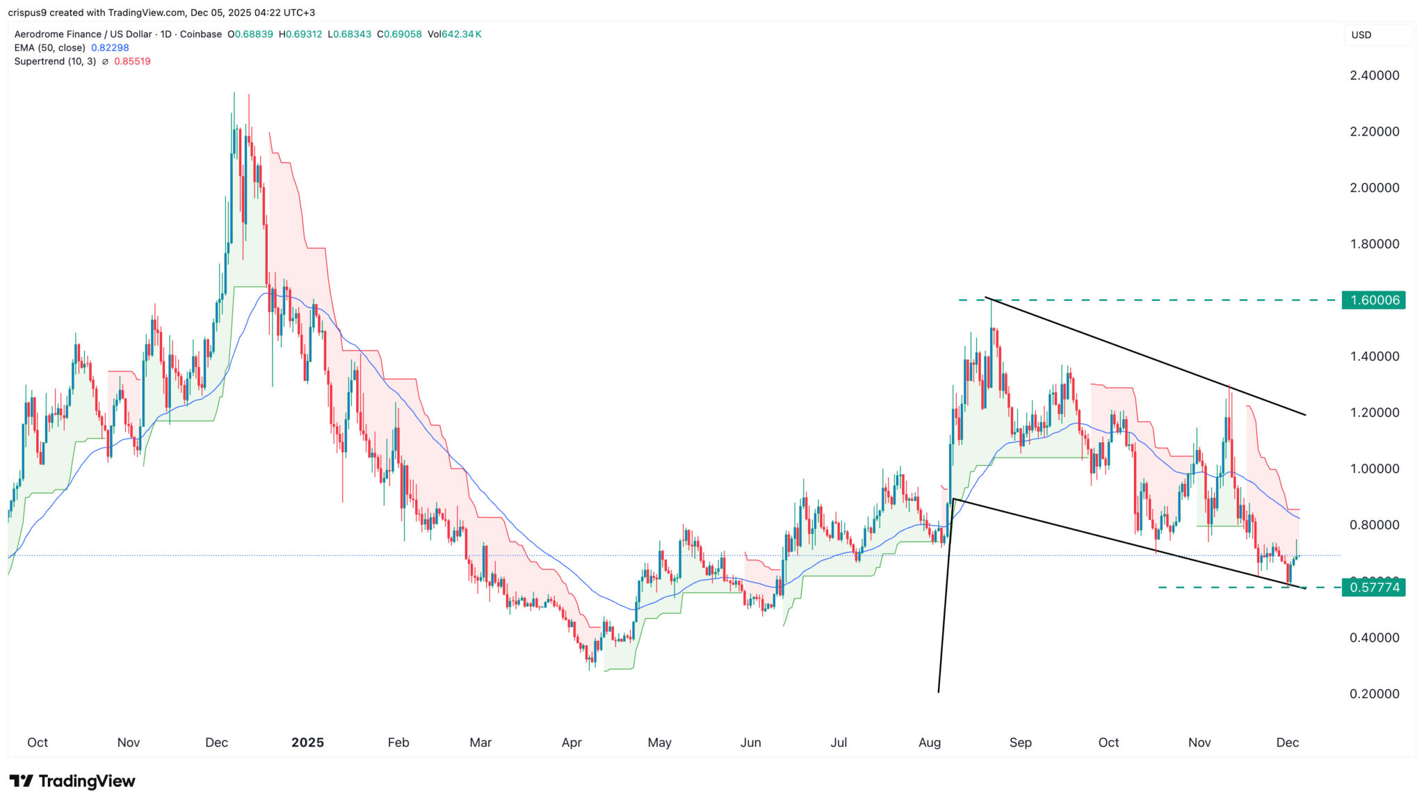 Aerodrome Finance Token Chart | Quelle: TradingViewDas Tagesdiagramm zeigt, dass der AERO-Kurs in den letzten Monaten unter Druck geraten ist. Er ist von einem Hoch von 1,60 $ im August auf aktuell 0,6890 $ gesunken.