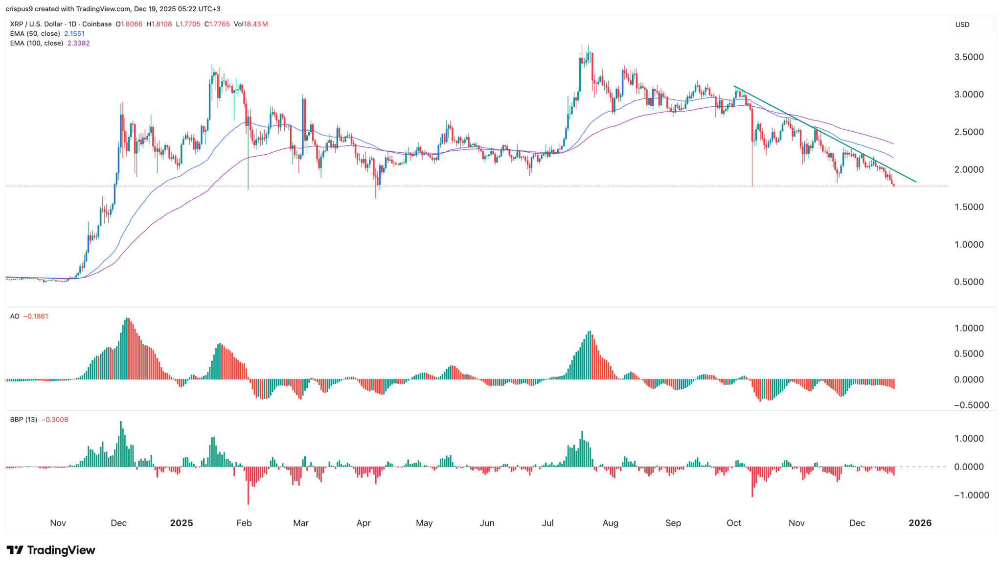 Schließlich haben auch technische Faktoren zu dem anhaltenden Absturz des XRP-Kurses beigetragen. Wie die Grafik unten zeigt, hat der Token seit Juli dieses Jahres eine Reihe von Tiefstständen gebildet. Er ist unter allen gleitenden Durchschnitten geblieben, während die Oszillatoren weiter gesunken sind.