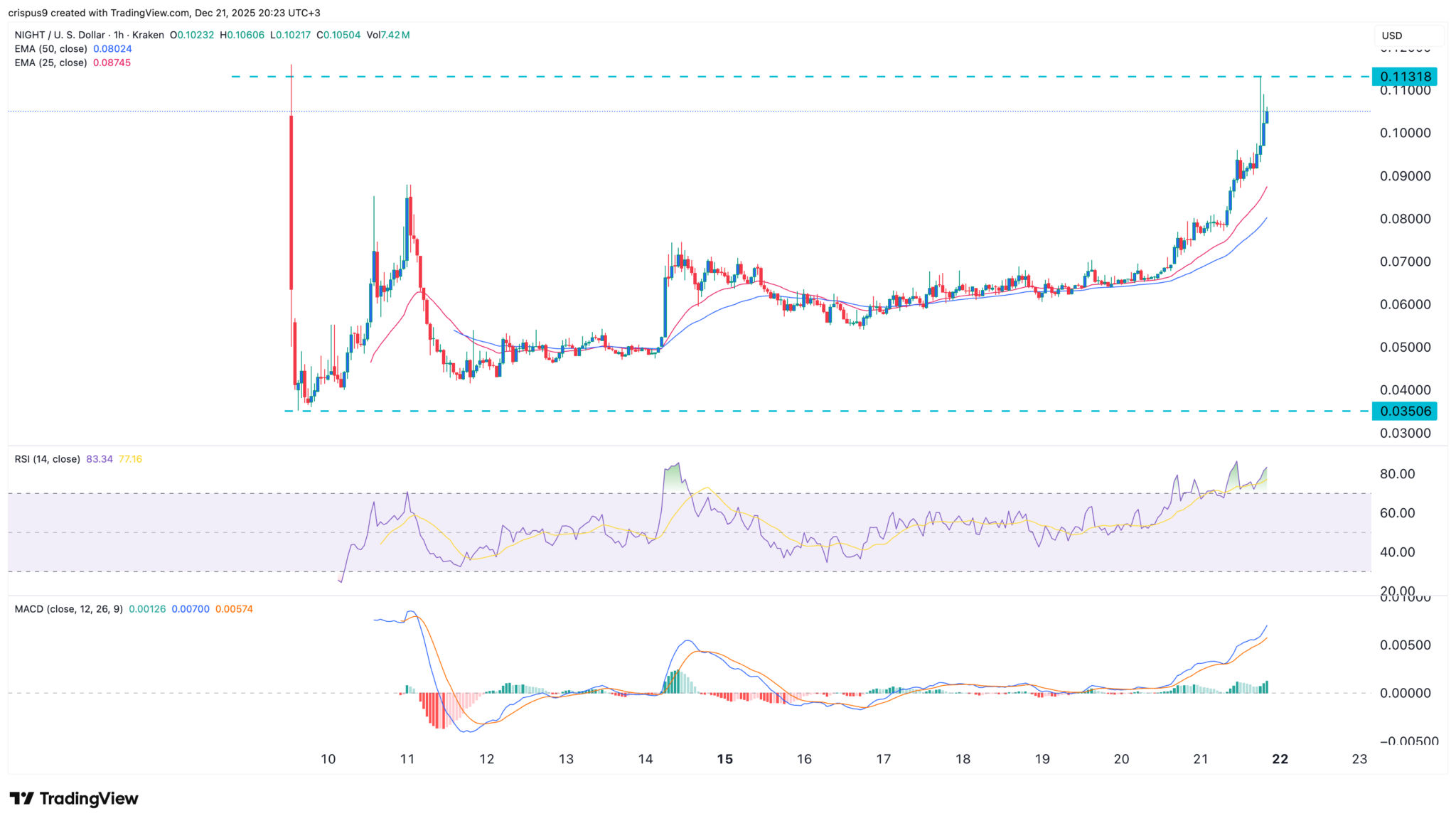 Der kürzlich eingeführte Krypto-Token NIGHT befindet sich in einer starken Aufwärtsbewegung, da die Nachfrage weiter steigt. Midnight sprang auf einen Höchststand von 0,1131 $, den höchsten Stand seit dem 9. Dezember, und 195% über sein Allzeittief, was ihm eine Marktkapitalisierung von über 1,7 Mrd. $ bescherte.