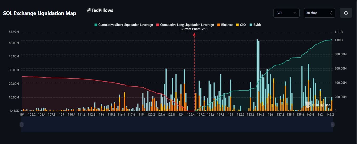 Solana Exchange Liquidation Map | @TedPillows on XDieses Ungleichgewicht deutet darauf hin, dass sich ein anhaltender Anstieg schnell beschleunigen könnte. Allerdings wird der Liquidationsdruck erst dann aktiv, wenn sich der Kurs bewegt. Im Moment bleibt der Solana-Kurs unterhalb des Widerstands, so dass die Abwärtsbewegung technisch möglich ist.