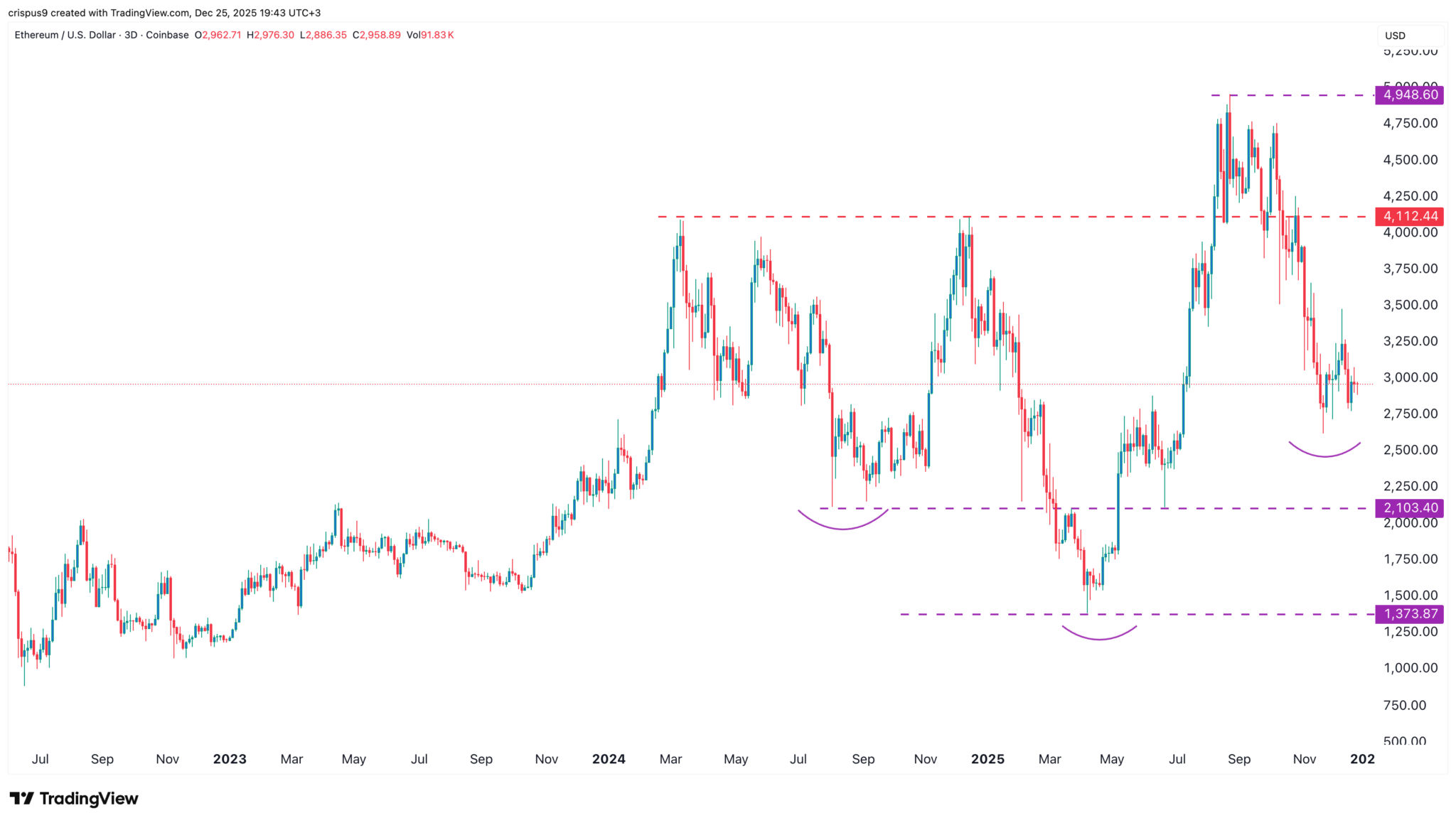 ETH-Kurs-Chart | Quelle: TradingViewIn unserer letzten ETH-Kursanalyse haben wir festgestellt, dass der Coin in den kommenden Tagen stark fallen könnte. Diese Einschätzung bleibt weiterhin bestehen. Der Drei-Tage-Chart deutet jedoch auf einen möglichen Wiederanstieg im kommenden Jahr hin.