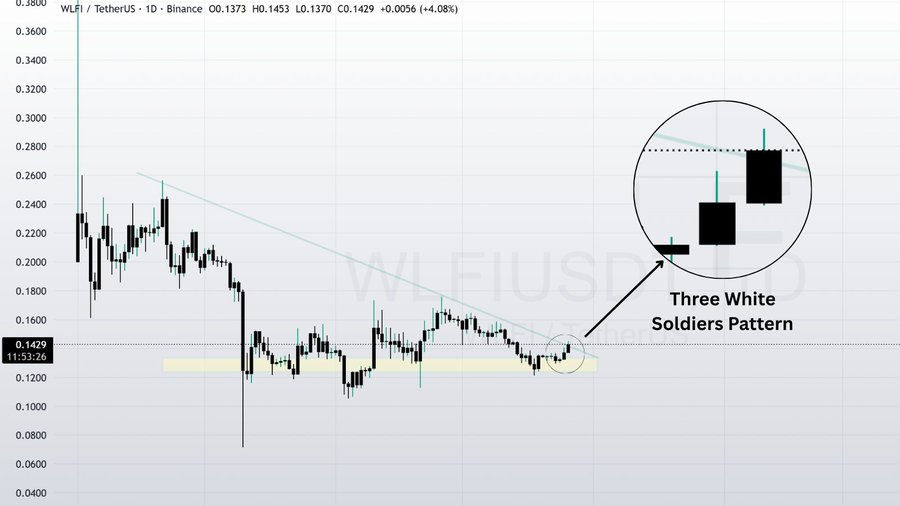 WLFI-Kurschart zeigt das Three White Soldiers Pattern | Keval Gala auf XDiese Formation aus drei aufeinanderfolgenden soliden Aufwärtskerzen signalisiert typischerweise eine Schwungumkehr aus früheren Abwärtstrends und eine zunehmende Kontrolle der Käufer. Die Nähe zu den jüngsten Tiefstständen spricht eher für eine Akkumulation als für eine Kapitulation.