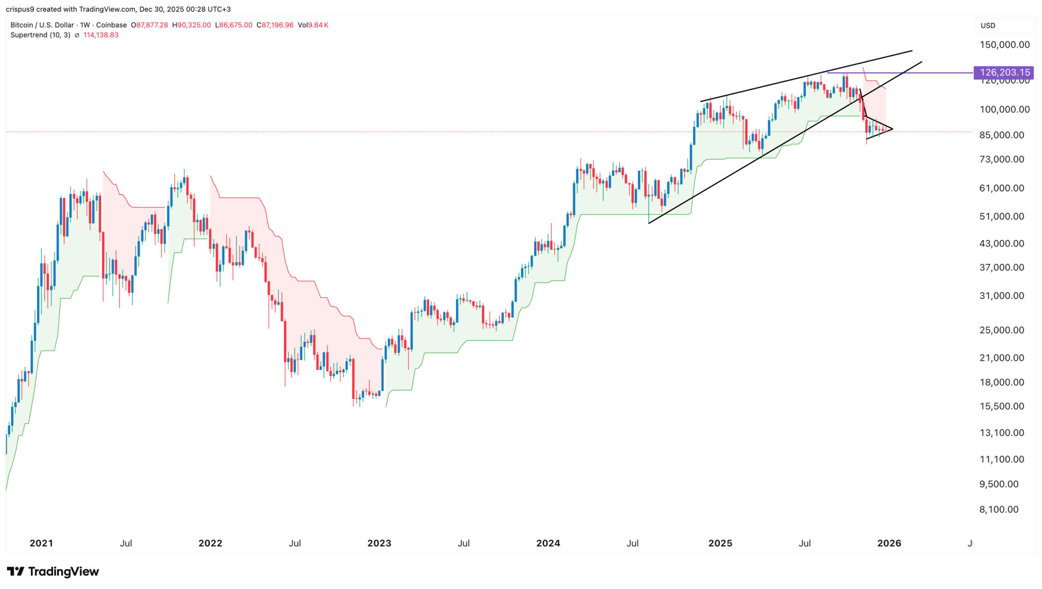 Die technischen Daten deuten darauf hin, dass der Bitcoin-Kurs im Januar dieses Jahres kurz vor einem großen Einbruch stehen könnte. Der Wochenchart unten zeigt, dass der Coin ein steigendes Keilmuster gebildet hat, das aus zwei aufsteigenden und konvergierenden Trendlinien besteht.