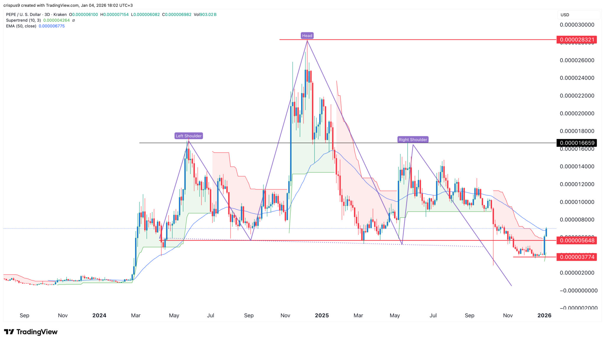 Der Token hat außerdem ein riesiges Kopf-Schulter-Muster gebildet, ein typisches Zeichen für eine Baisse. Der Kopfabschnitt liegt bei $0,00002832, während die Schultern bei $0,00001665 liegen.