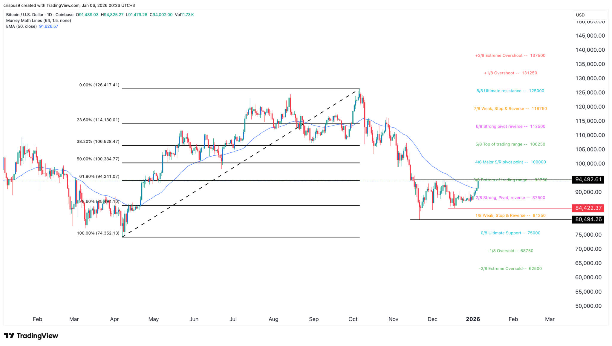 Der Coin liegt weiterhin auf dem 61,8% Fibonacci Retracement Level und leicht über dem 50-Tage Exponential Moving Average (EMA). Daher ist die wahrscheinlichste Bitcoin-Prognose bullisch, wobei das erste Ziel bei 100.000 $ liegt. Dieser Kurs deckt sich mit dem Major S&R Pivot Point des Murrey Math Lines Tools.