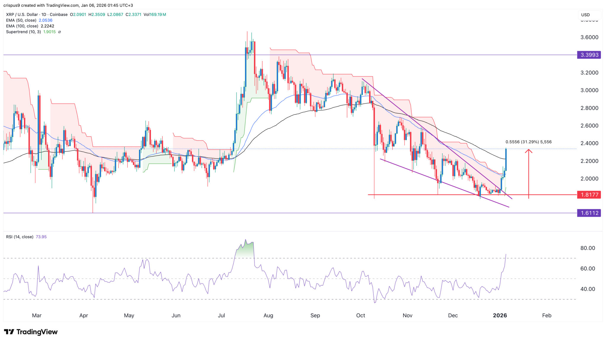 Der Token ist über die gleitenden Durchschnitte der 50- und 100-Tage-Linie gesprungen. Außerdem ist er zum ersten Mal seit Juli letzten Jahres über den Supertrend-Indikator gestiegen. Das Überschreiten dieses Indikators führt oft zu weiteren Kursgewinnen im Laufe der Zeit. Das letzte Mal, als dies geschah, stieg der Kurs um 65 % und erreichte sein Allzeithoch bei 3,6645 $.