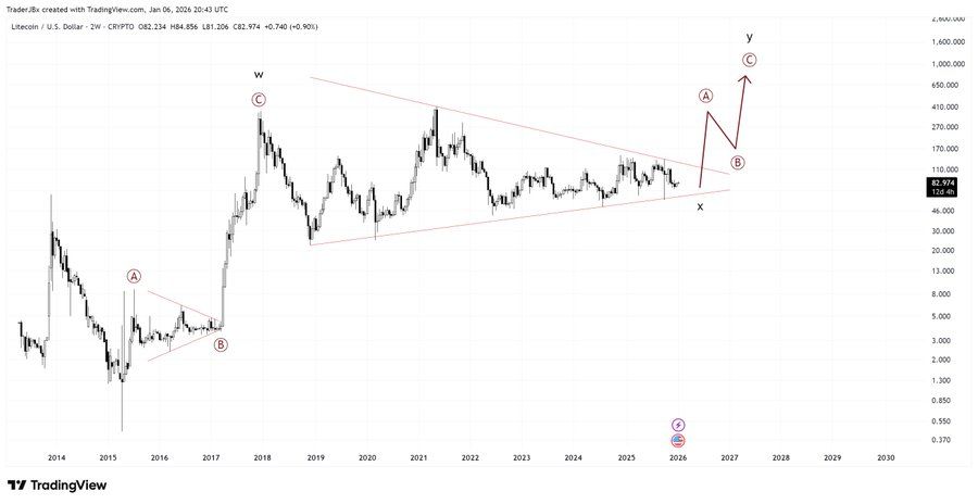 Litecoin-Preisanalyse | Quelle: TraderJBx on XUm diese Struktur aufzulösen, wird der gesamte Anstieg von den vorherigen Tiefstständen des Zyklus als Teil einer breiteren WXY-Korrekturkombination behandelt.