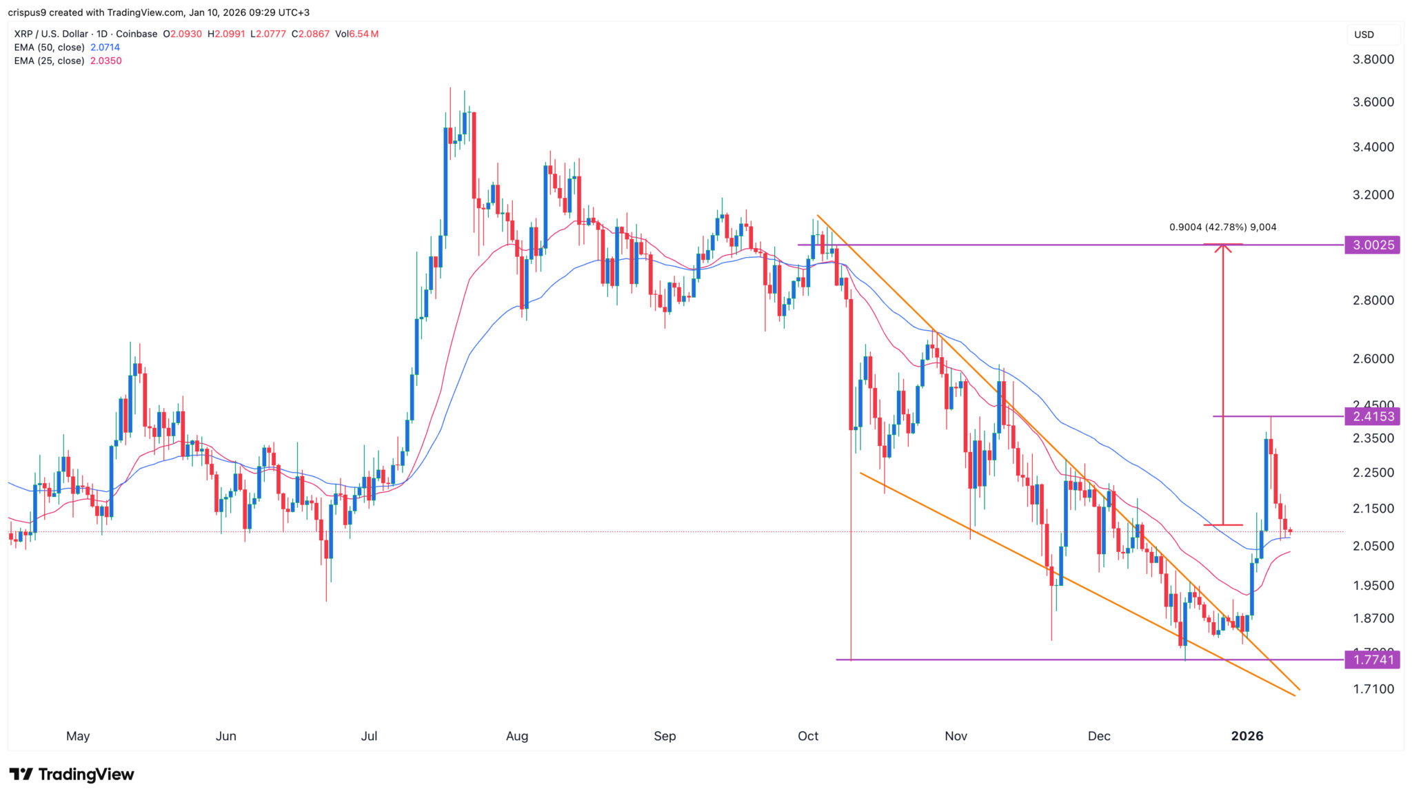 XRP ist von einem Höchststand von 2,4153 $ auf derzeit 2,06 $ zurückgefallen. Positiv ist, dass er über dem exponentiellen gleitenden Durchschnitt (EMA) von 50 und 25 Tagen geblieben ist.
