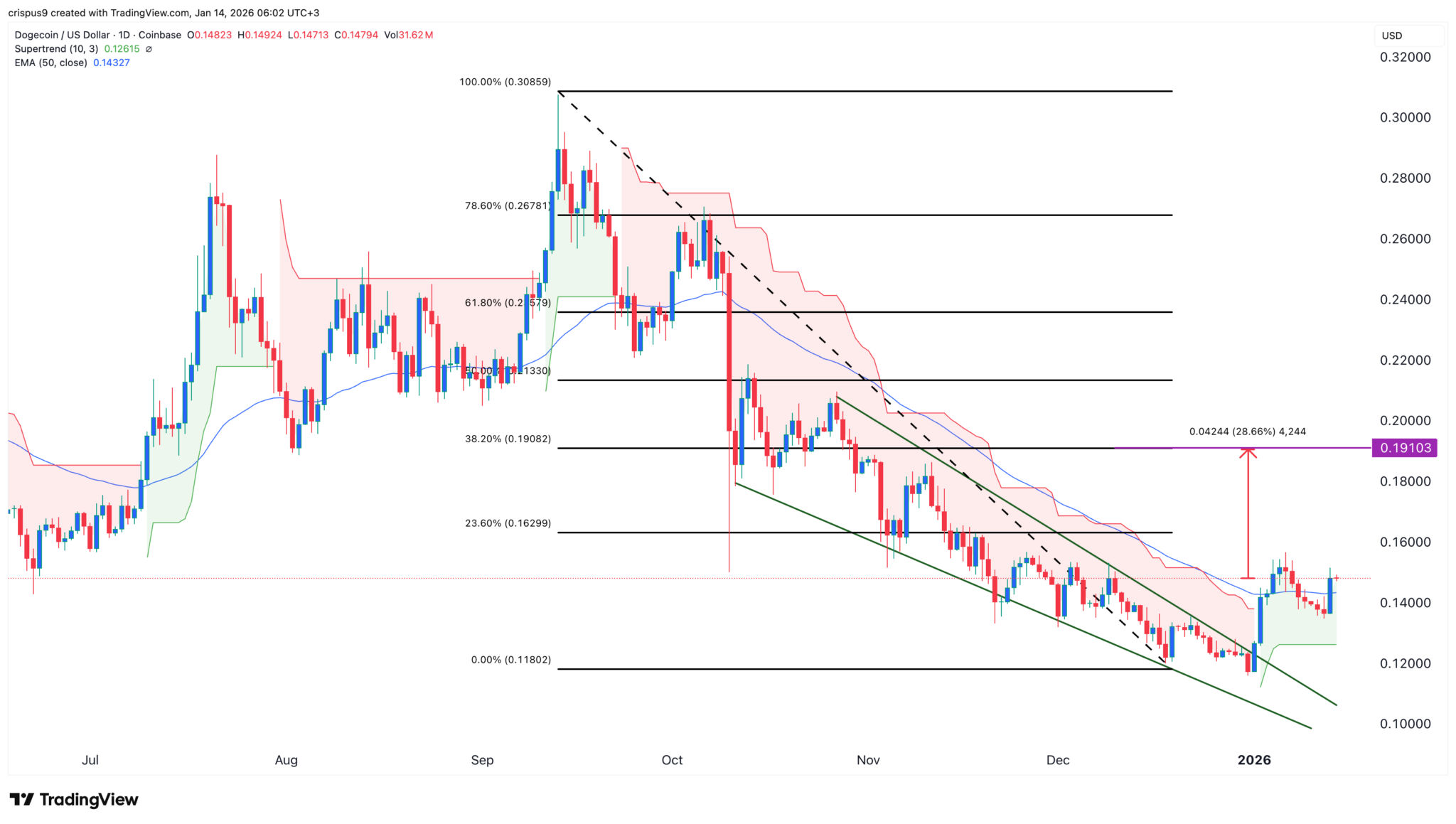 Das Tages-Chart zeigt, dass der DOGE-Kurs zwischen Oktober und dem 1. Januar ein riesiges fallendes Keilmuster gebildet hat. Dieses Muster besteht aus zwei abfallenden und konvergierenden Trendlinien. Der Aufschwung kam, als sich die beiden Linien ihrer Konvergenz näherten.