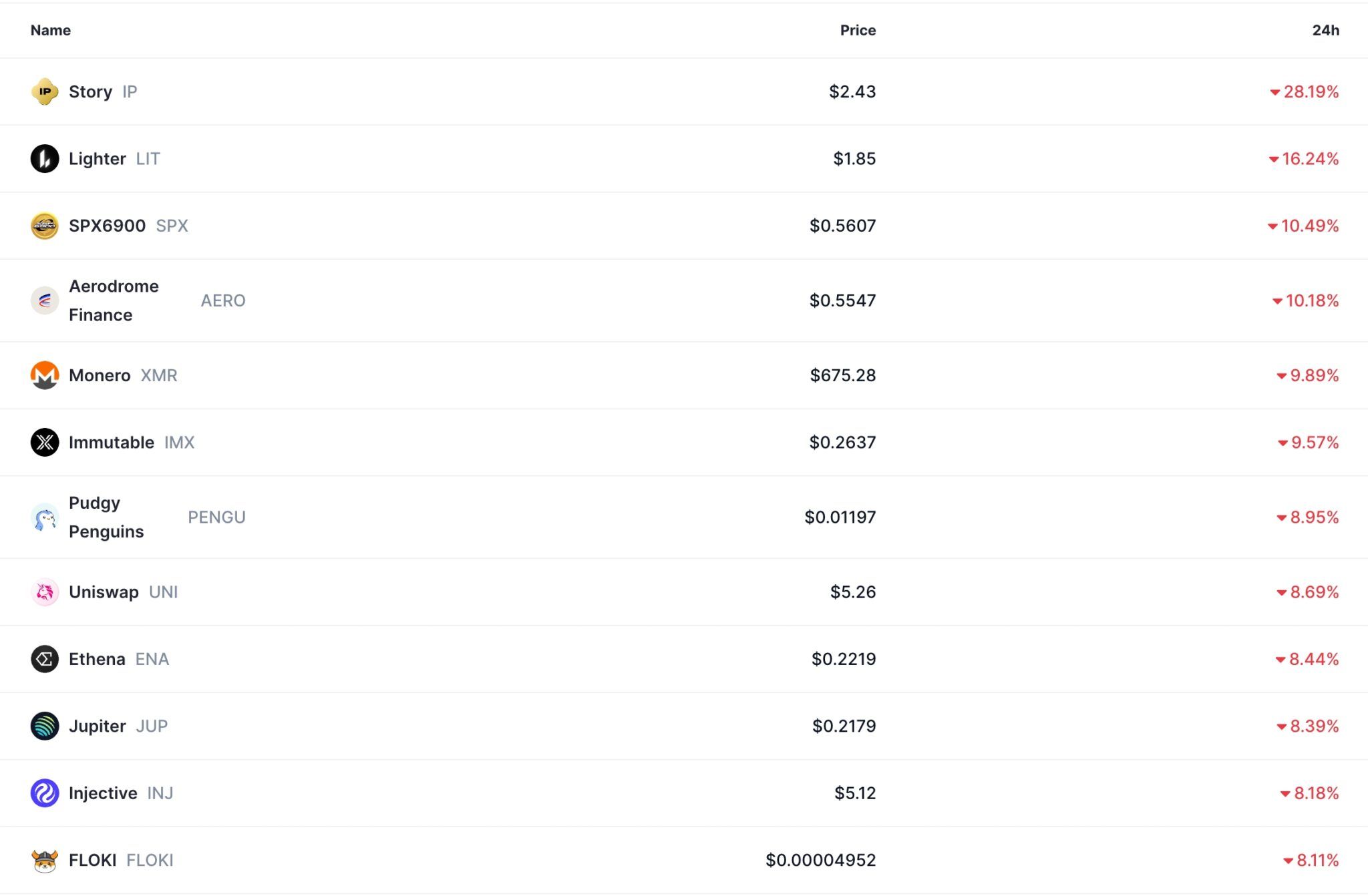 Es gibt gerade einen Krypto-Crash, bei dem Bitcoin und die wichtigsten Altcoins einen Teil ihrer bisherigen Gewinne wieder verloren haben. Token wie Story (IP), SPX6900 (SPX), Aerodrome Finance (AERO) und Monero sind um zweistellige Prozentsätze gefallen. Dadurch ist die Marktkapitalisierung aller Coins um 2,45 % auf 3,2 Billionen Dollar gesunken.
