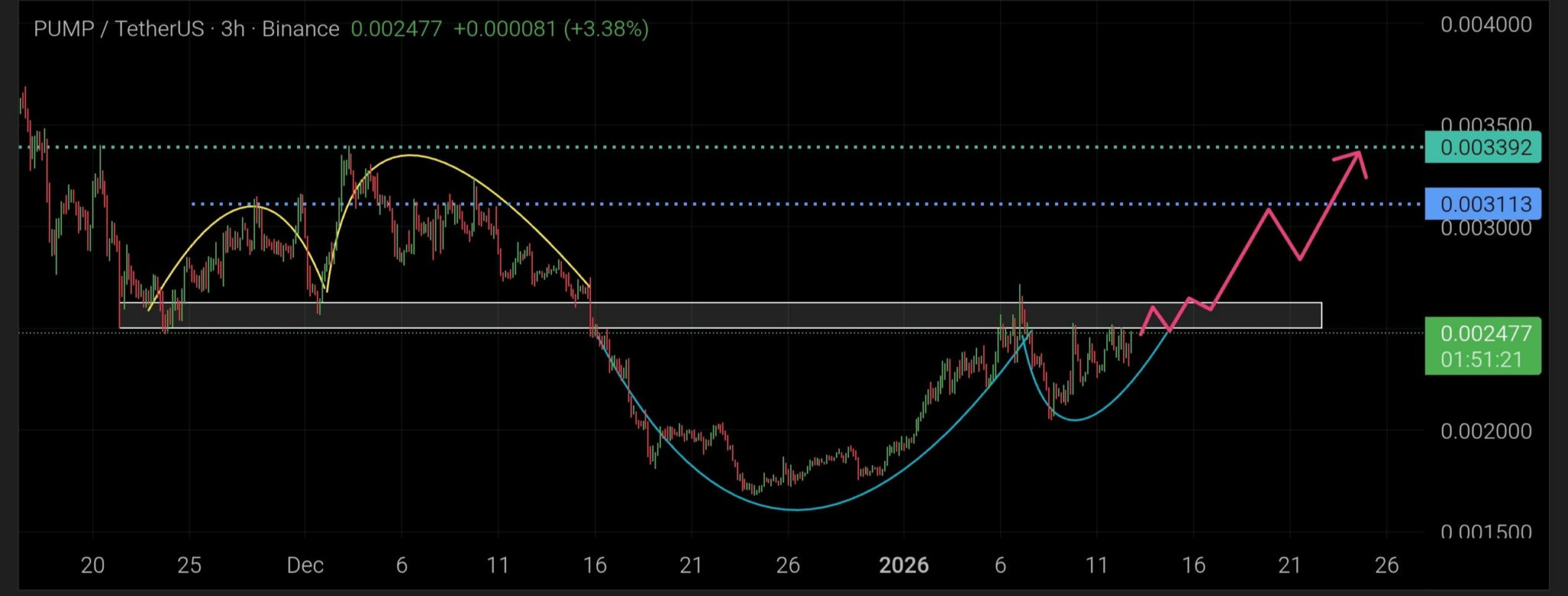 Die technische Aufmerksamkeit konzentrierte sich auf eine sich entwickelnde Cup-and-Handle-Struktur nach einer längeren Basis. Ali Charts signalisierte einen Ausbruch aus dem Muster und identifizierte 0,00378 $ als gemessenes Ziel, wenn der PUMP-Kurs die Formation vollendet. Seine Analyse betrachtet den jüngsten Anstieg als einen Übergang von der Akkumulation zur Fortsetzung, wobei sich der Griff bildete, nachdem Pump Fun den Bereich von 0,00265 $ zurückerobert hatte.