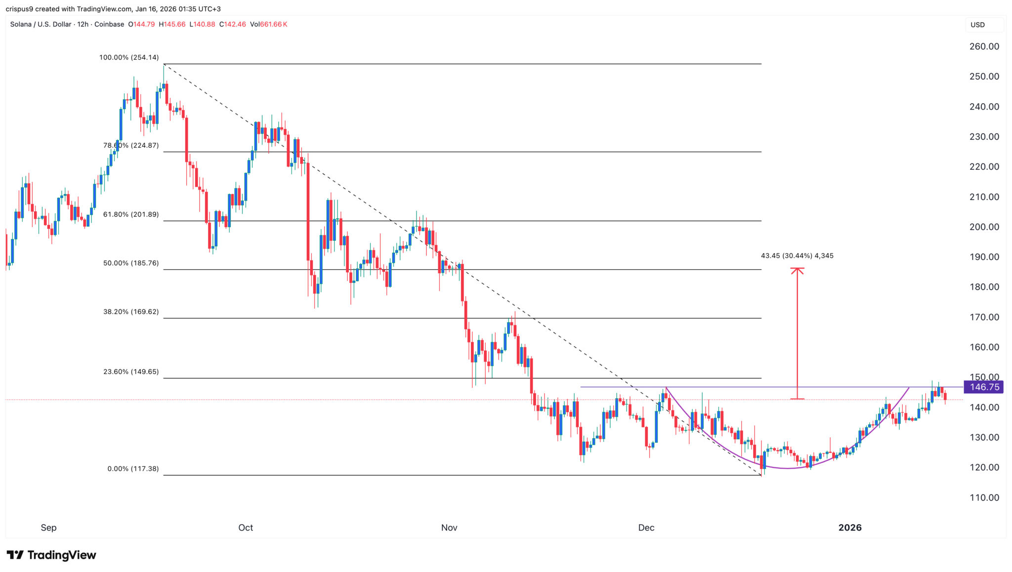 SOL-Preisdiagramm | Quelle: TradingViewDer 12-Stunden-Chart zeigt, dass Solana sehr bullische technische Faktoren aufweist, die seine Performance in naher Zukunft steigern werden. Der Kurs stieg von einem Tiefststand von 117 US-Dollar im Dezember auf einen Höchststand von 146 US-Dollar.