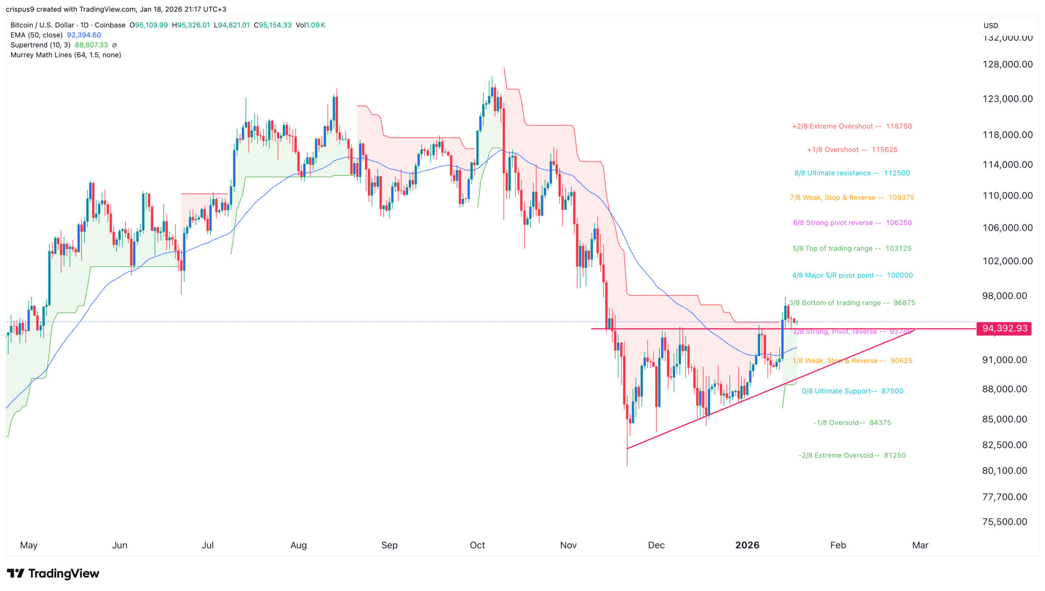 Die Coin hat sich über den exponentiellen gleitenden 50-Tage-Durchschnitt (EMA) und den Supertrend-Indikator bewegt. Daher ist die wahrscheinlichste BTC-Preisprognose bullish, wobei das nächste wichtige Ziel bei 100.000 USD liegt, was mit dem wichtigen S&R-Pivot-Punkt des Murrey-Math-Lines-Tools übereinstimmt.