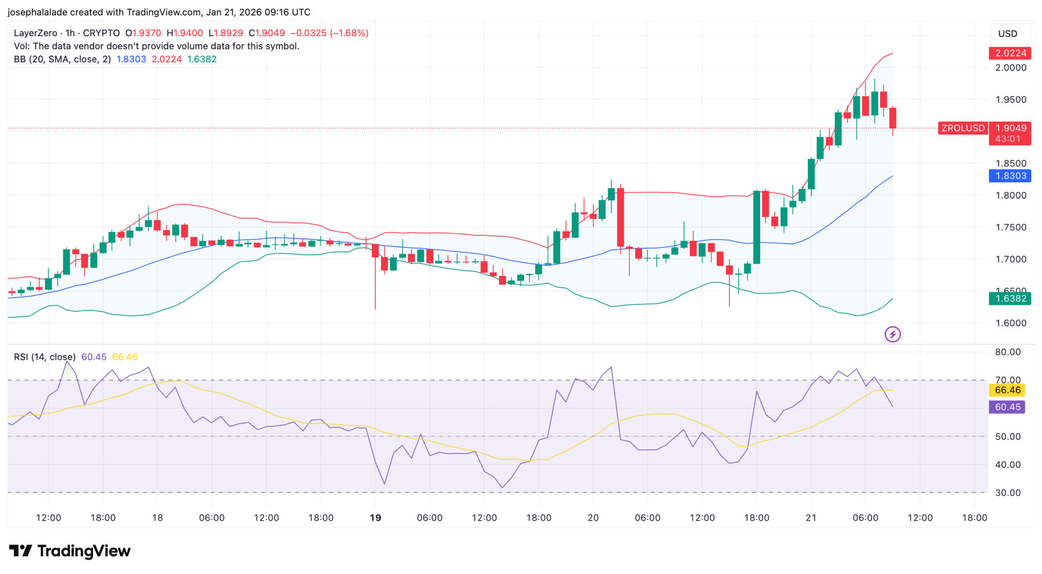 Der LayerZero-Kurs hat sich in Richtung der Spitze seiner aktuellen Struktur bewegt. Auf kürzeren Zeiträumen wird der Kurs nahe dem oberen Bollinger-Band bei 2,00 USD gehandelt, wobei das untere Band bei 1,63 USD die jüngste Expansion umrahmt. Der RSI ist in Richtung der hohen 60er-Marke geklettert und zeigt damit eine starke Dynamik, aber wenig Spielraum für Fehler, wenn sich der Kauf abkühlt.