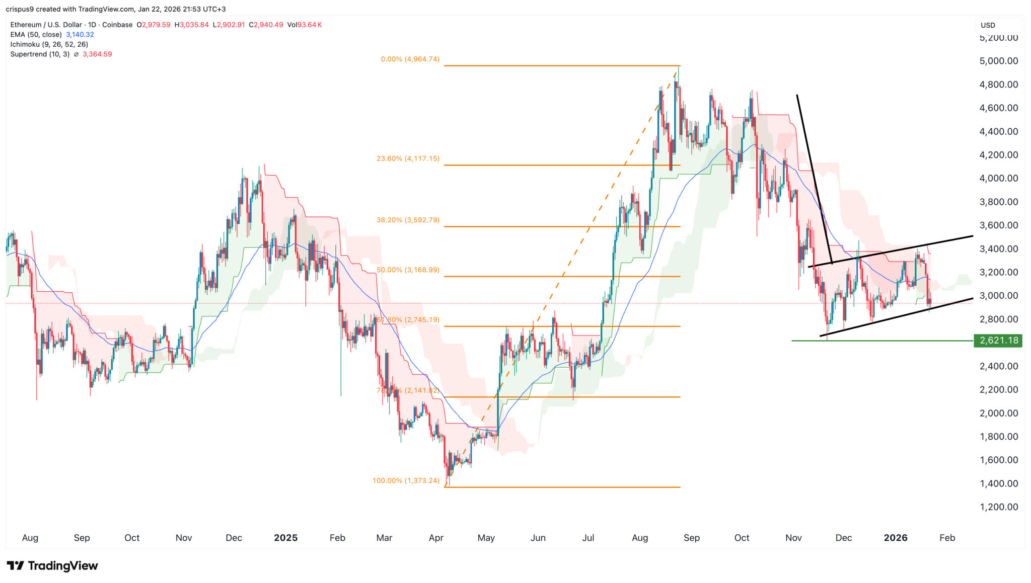 Die Coin ist unter den exponentiellen gleitenden Durchschnitt (EMA) von 50 Tagen und das 50 %-Fibonacci-Retracement-Niveau von 3.168 USD gefallen.