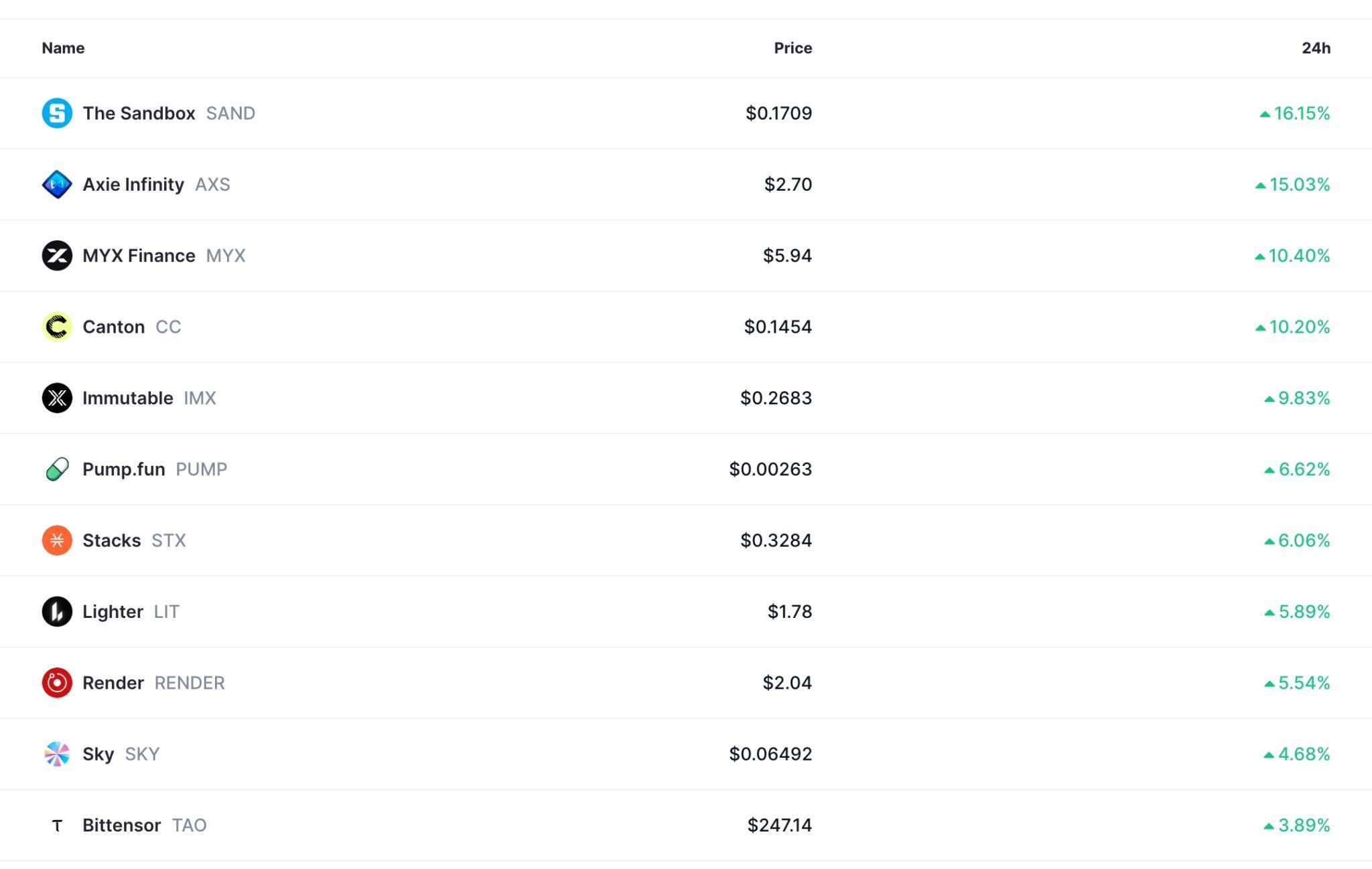 The Sandbox (SAND) war eine der Kryptowährungen mit der besten Performance, da sie um über 15 % zulegte. Der Canton (CC)-Token stieg um 11 %, während MYX Finance, Immutable und Pump.fun um über 7 % zulegten. Zu den weiteren Top-Gewinnern auf dem Kryptomarkt gehörten Coins wie Axie Infinity, Render und Stacks.