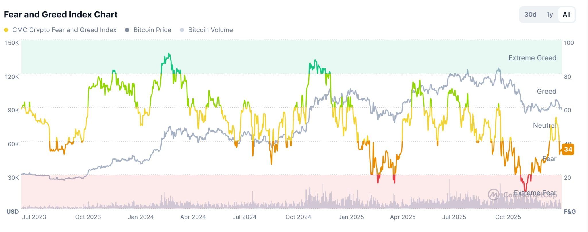 Der Crash des Kryptomarktes findet auch statt, während der Crypto Fear and Greed Index weiter nach unten geht. Daten von CoinMarketCap zeigen, dass der Index von seinem Jahreshoch von 59 auf die Angstzone von 34 gefallen ist.